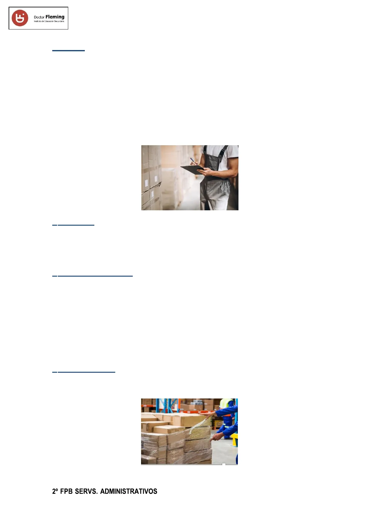 Documento del Doctor Fleming Instituto de Educación Secundaria sobre Preparación de Pedidos y Venta de Productos. El Pdf, de Formación profesional en Economía, explora la gestión de almacén, los tipos de embalaje y las fases de preparación de pedidos, incluyendo sistemas de almacenamiento y medios de transporte.