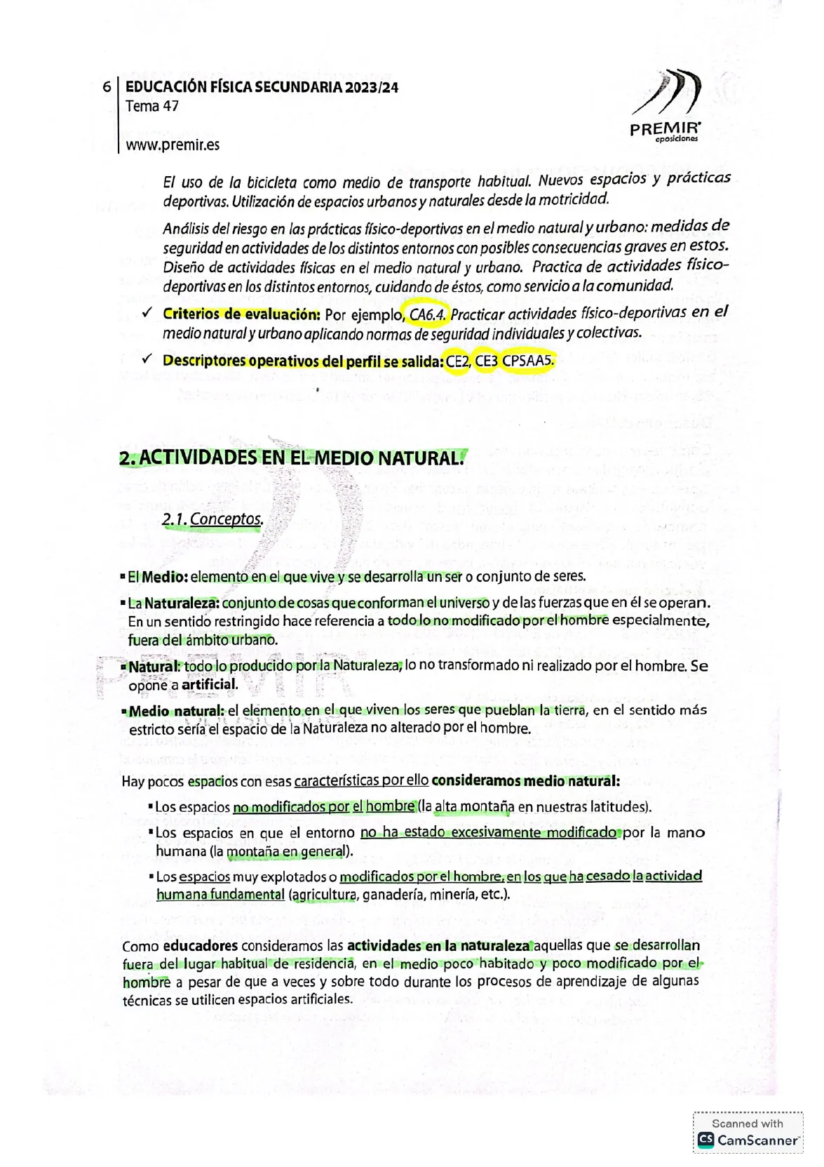 Documento de Premir sobre Educación Física Secundaria 2023/24 Tema 47. El Pdf, un material para Oposiciones de Educación física, explora la importancia de la actividad física al aire libre, la legislación pertinente y las competencias clave, incluyendo conceptos como acampada y marcha.