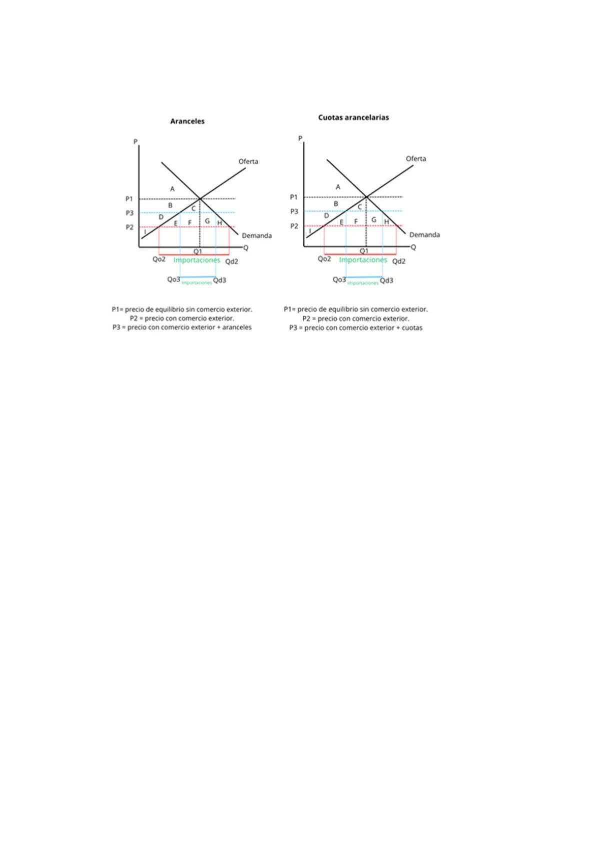P1= precio de equilibrio sin comercio exterior. P2 = precio con comercio exterior. P3 = precio con comercio exterior + cuotas