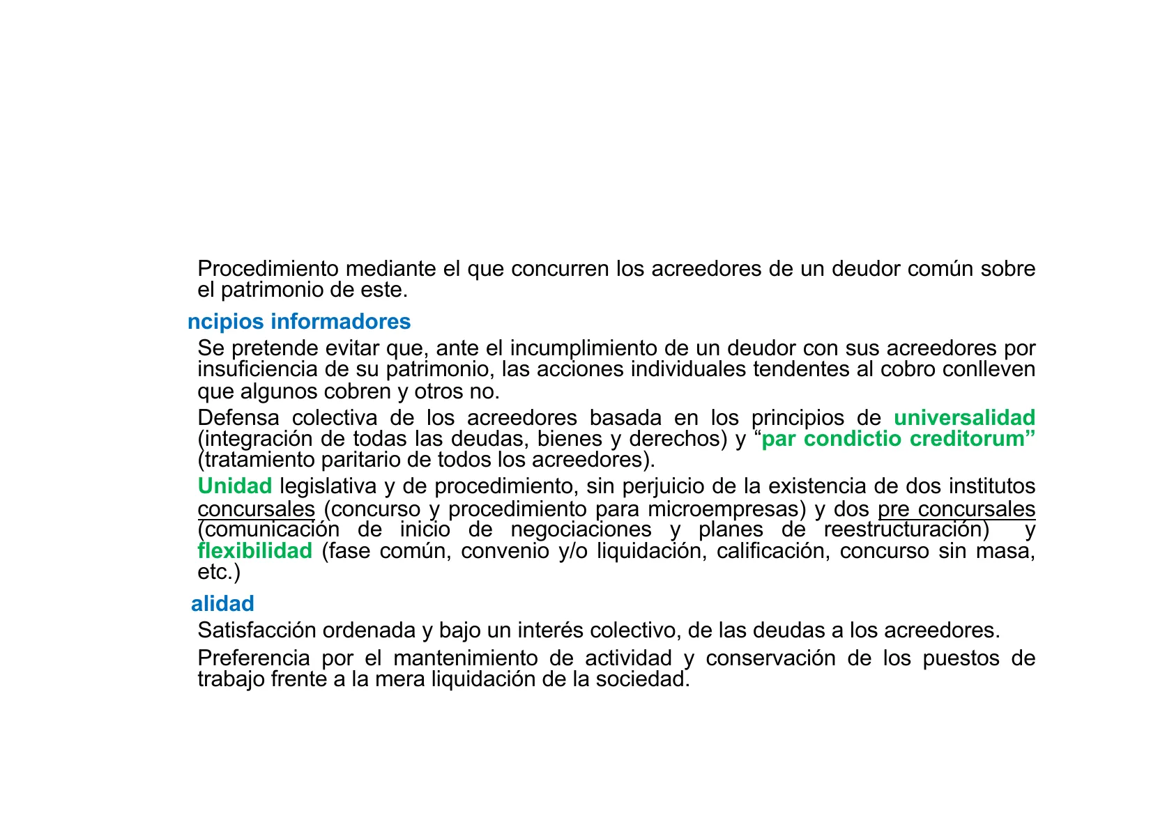 Se pretende evitar que, ante el incumplimiento de un deudor con sus acreedores por insuficiencia de su patrimonio, las acciones individuales tendentes al cobro conlleven que algunos cobren y otros no. Defensa colectiva de los acreedores basada en los principios de universalidad (integración de todas las deudas, bienes y derechos) y "par condictio creditorum" (tratamiento paritario de todos los acreedores). Unidad legislativa y de procedimiento, sin perjuicio de la existencia de dos institutos concursales (concurso y procedimiento para microempresas) y dos pre concursales (comunicación de inicio de negociaciones y planes de reestructuración) y flexibilidad (fase común, convenio y/o liquidación, calificación, concurso sin masa, etc.)