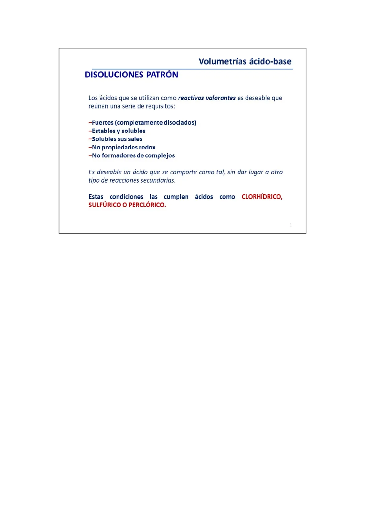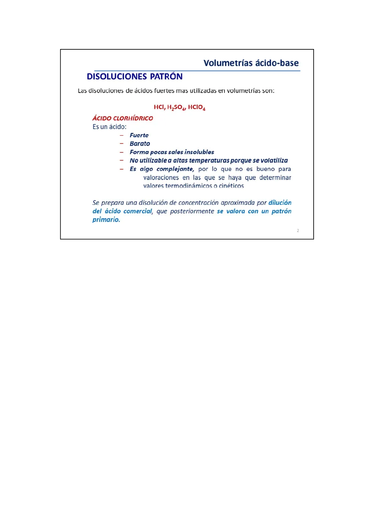 Las disoluciones de ácidos fuertes mas utilizadas en volumetrías son: HCI, H2SO 4, HCIO4