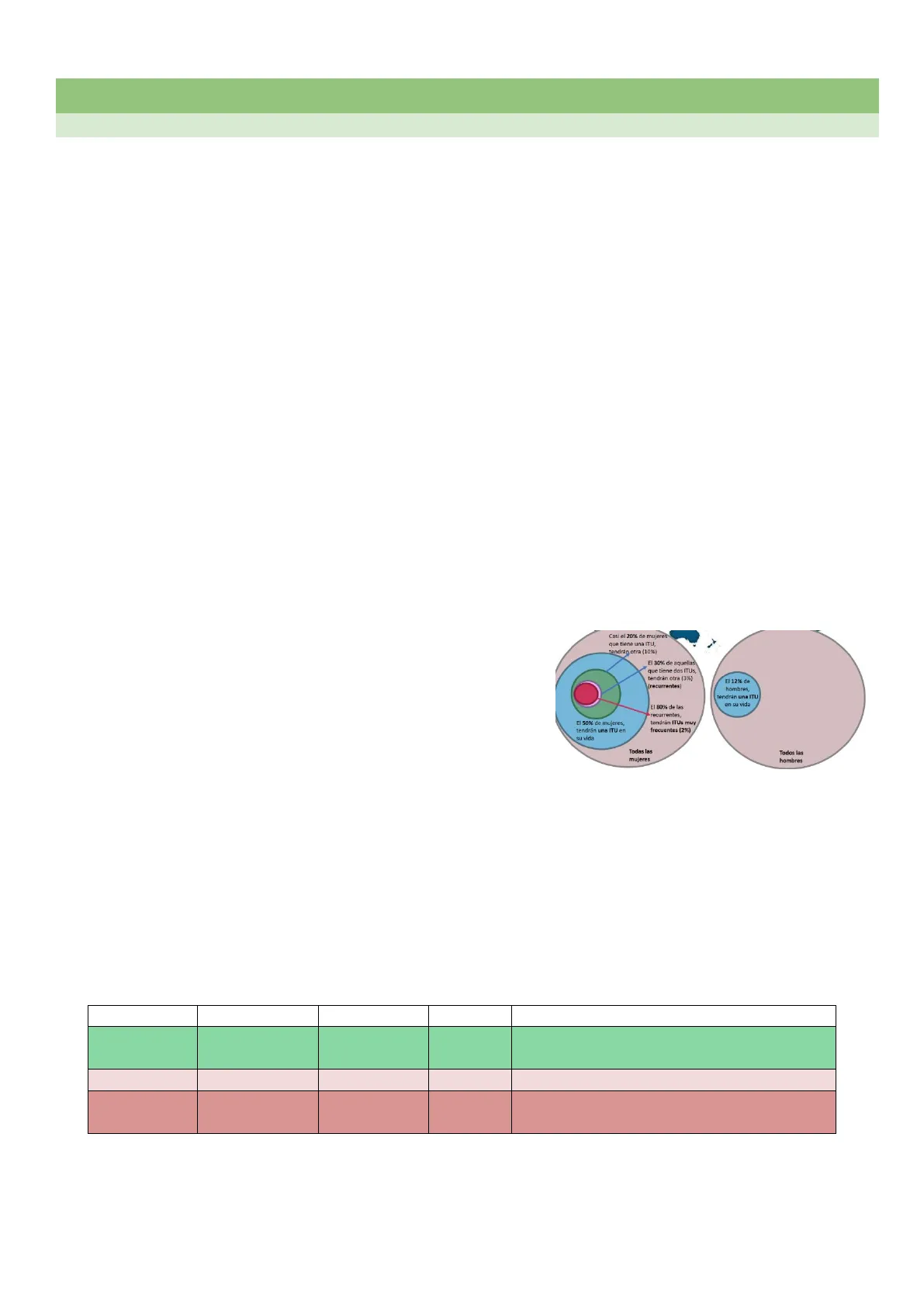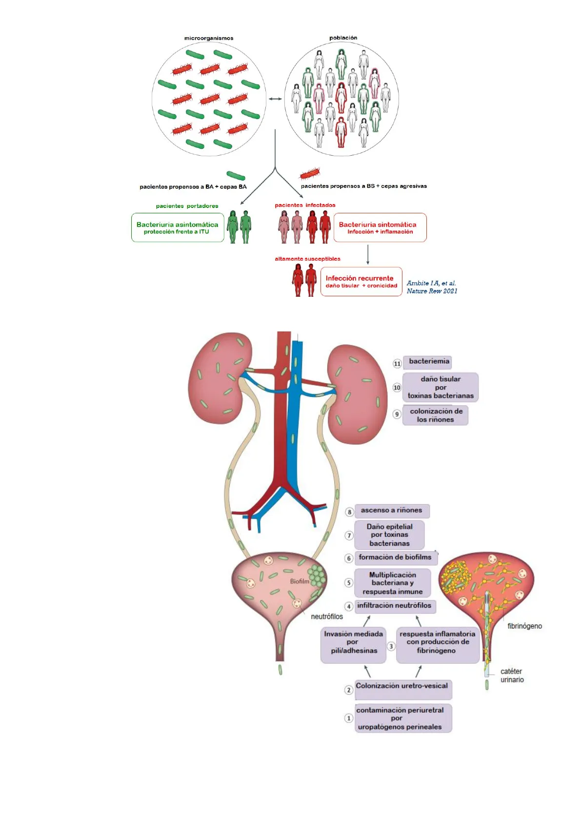 Población Cepa Bacteriuria Paciente Consecuencias No propensa Poco agresiva Asintomática Portador Protección frente a ITU: evita que asienten en la zona bacterias más patógenas Propensa Agresiva Sintomática Infectado Infección e inflamación Altamente susceptible Agresiva Recurrente Infectado Daño tisular y cronicidad Casi el 20% de mujeres que tiene una ITU, tendrán otra (10%) El 30% de aquellas que tiene dos ITUs, tendrán otra (3%) recurrentes) El 12% de hombres, tendrán una ITU en su vida El 50% de mujeres, tendrán una ITU en su vida El 80% de las recurrentes, tendrán ITUs muy frecuentes (2%) Todas las mujeres Todos las hombres NEFROLOGÍA Y UROLOGÍA 1microorganismos población pacientes propensos a BA + cepas BA pacientes propensos a BS + cepas agresivas pacientes portadores pacientes infectados Bacteriuria asintomática protección frente a ITU Bacteriuria sintomática Infección + inflamación altamente susceptibles Infección recurrente daño tisular + cronicidad Ambite I A, et al. Nature Rew 2021