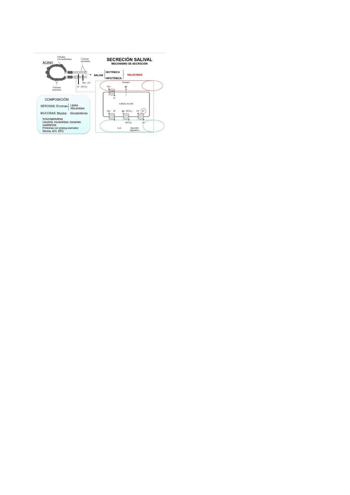 Puntos clave: · La saliva inicial es isotónica y se modifica a hipotónica en los conductos. · El intercambio iónico en las células ductales es crucial para la composición final de la saliva. · La saliva contiene enzimas digestivas, mucina, sustancias antimicrobianas y otros componentes importantes.