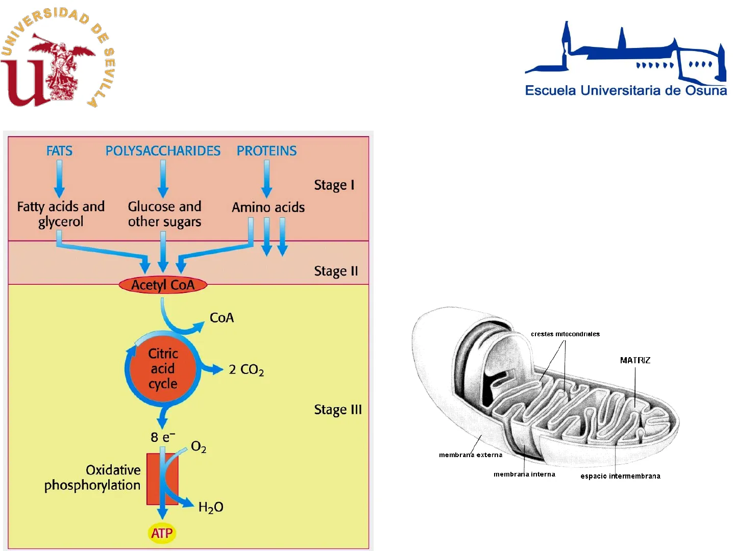 FATS POLYSACCHARIDES PROTEINS I Stage I Fatty acids and glycerol Glucose and other sugars Amino acids Stage II Acetyl COA CoA Citric acid cycle 2 CO2 Stage III 8 e- O2 Oxidative phosphorylation K H2O ATP