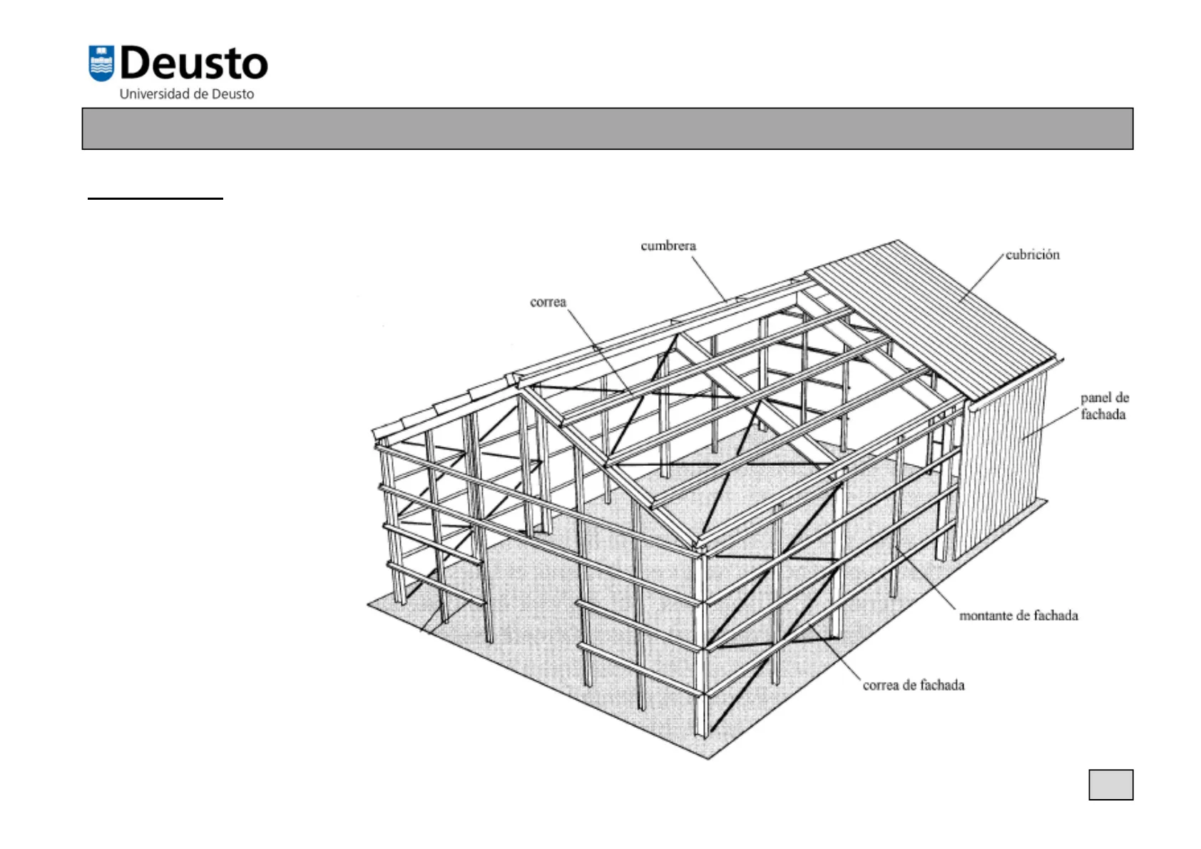 cumbrera cubrición correa panel de fachada montante de fachada correa de fachada 1Deusto Universidad de Deusto MASTER UNIVERSITARIO EN INGENIERÍA INDUSTRIAL COMPLEJOS E INSTALACIONES INDUSTRIALES 4. PROYECTO DE EDIFICIOS INDUSTRIALES. Soluciones constructivas.