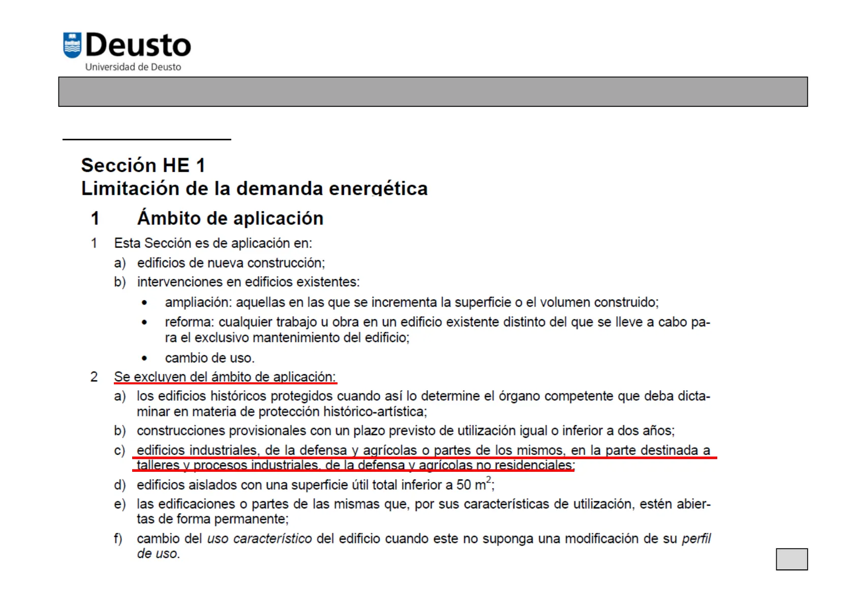 Diapositivas de la Universidad de Deusto sobre Proyecto de Edificios Industriales: Soluciones Constructivas. El Pdf explora las soluciones constructivas para edificios industriales, con foco en el envolvente, los requisitos del CTE para la demanda energética y soluciones específicas para fachadas y cubiertas, para la asignatura de Tecnología a nivel universitario.