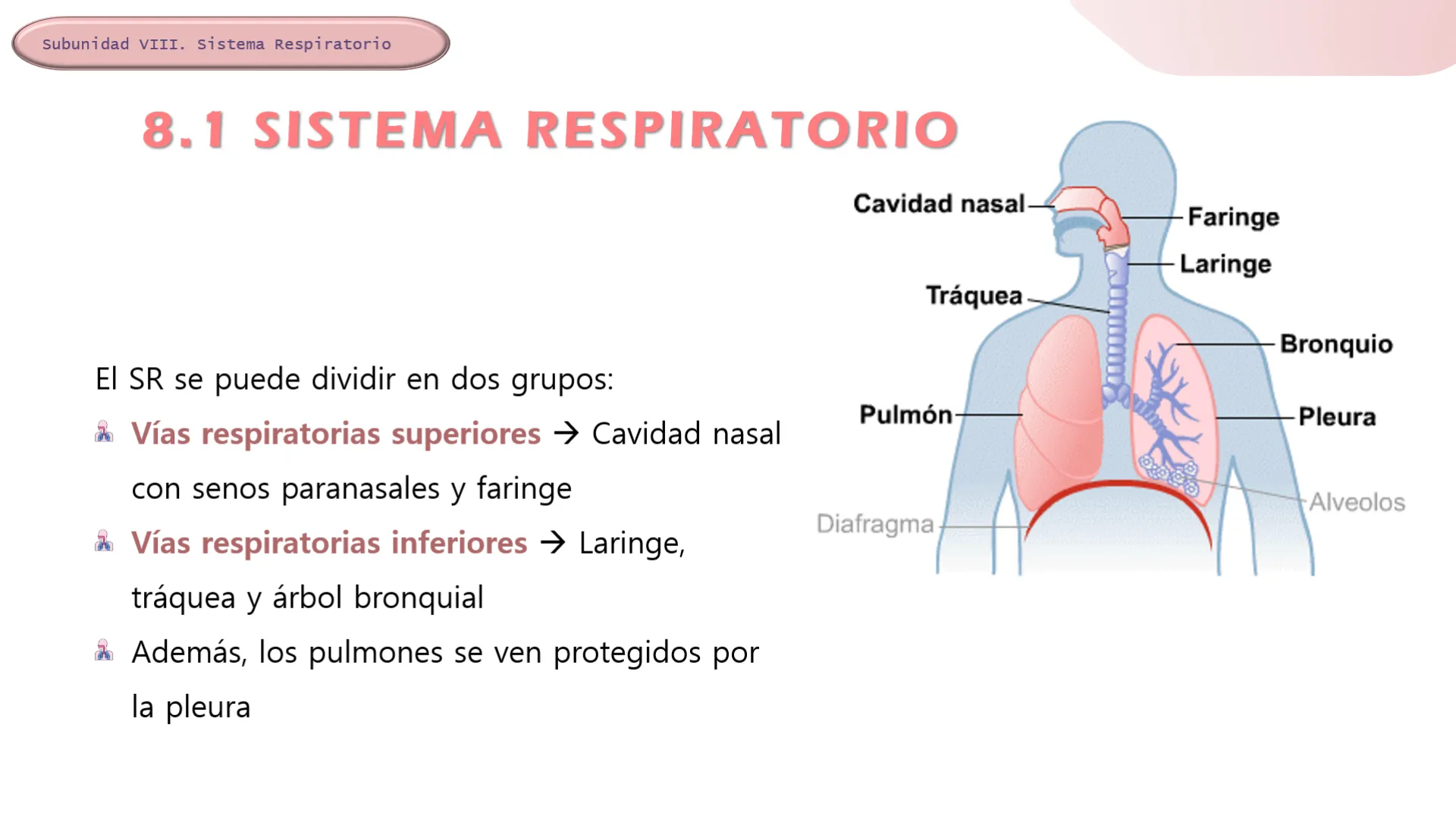Cavidad nasal Faringe Laringe Tráquea Bronquio Pulmón Pleura Diafragma Alveolos
