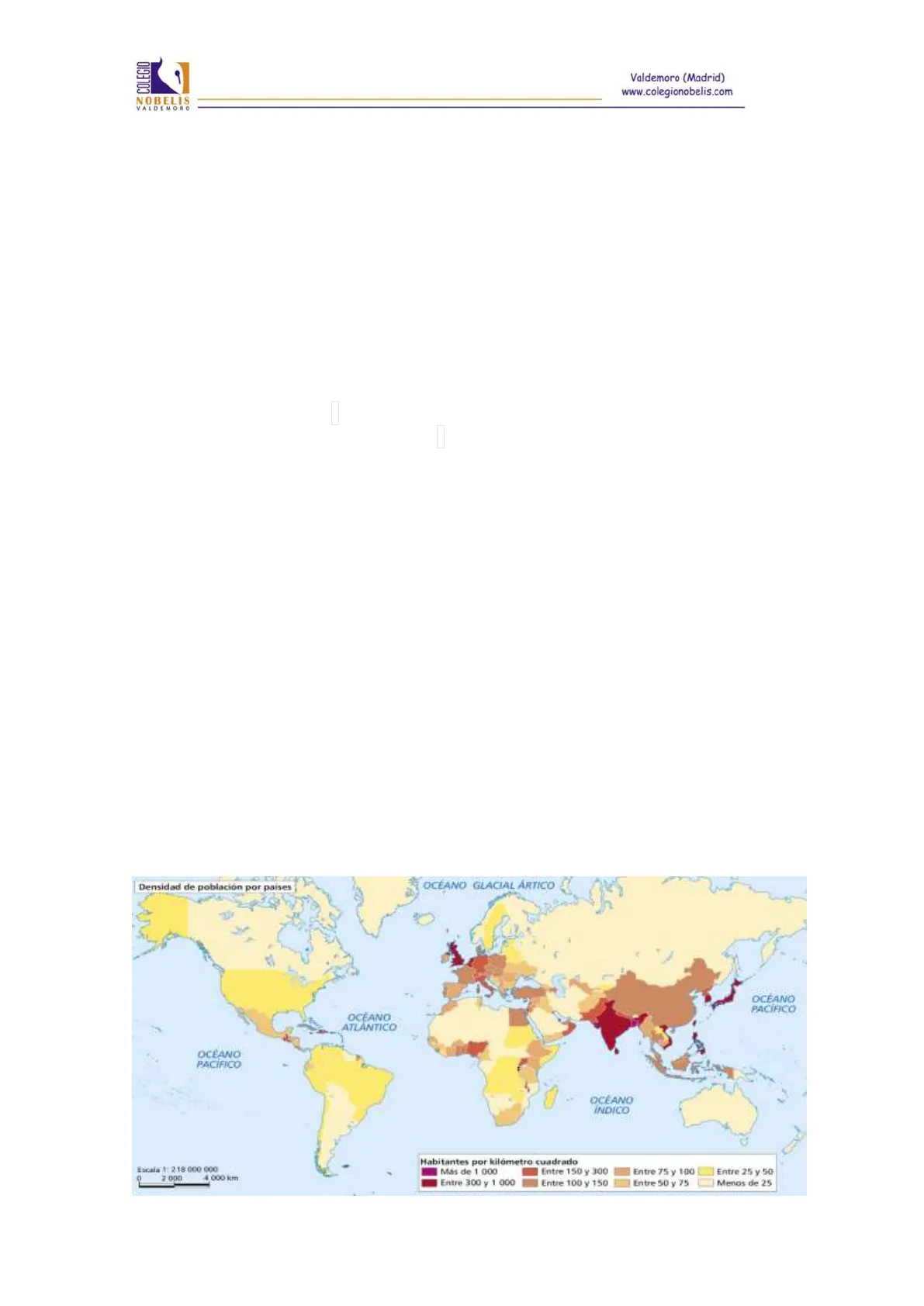 Densidad=Población(hab./km2)Superficie(km2) Si se analiza el reparto de la población del mundo, se observa que es muy irregular. Por un lado, muchas zonas constituyen vacíos o desiertos demográficos (con densidades inferiores a los 10 hab./km2), mientras que otras son áreas superpobladas (con densidades superiores a los 200 hab./km2). La desigual distribución de la población en el mundo se debe a diferentes causas, entre las que destacan los factores físicos: el clima, ya que la mayor parte de la población vive en zonas templadas, el acceso a recursos naturales (agua, suelos fértiles, yacimientos de minerales, etc.) y el relieve, puesto que los valles, las costas y las áreas de alturas medias son más favorables para los asentamientos. Entre los factores humanos sobresalen la intensidad y prosperidad de la actividad económica, y el mantenimiento de la paz. Áreas superpobladas. En el hemisferio norte, que cuenta con mayor proporción de tierras emergidas con climas templados, viven el 90% de los habitantes del planeta. Por regiones, destacan las concentraciones demográficas de Asia Oriental y Meridional, Europa Occidental y Central, y las costas norteamericanas, sobre todo la costa Este. Vacíos demográficos. Los desiertos de población coinciden con las áreas cercanas a los polos, los grandes desiertos cálidos y fríos, las zonas de alta montaña y las áreas ecuatoriales, territorios que con más del 40% de la superficie terrestre solo albergan al 2% de la población. El interior de los continentes en ocasiones también presenta bajas densidades de población. Densidad de población por paises OCÉANO GLACIAL ÁRTICO OCÉANO PACÍFICO OCÉANO ATLANTICO OCÉANO PACÍFICO OCÉANO INDICO Habitantes por kilómetro cuadrado Escala : 2 18 000 000 0 7 000 4.000 km Más de 1 000 Entre 300 y 1 000 Entre 150 y 300 Entre 100 y 150 Entre 75 y 100 Entre 50 y 75 Entre 25 y 50 Menos de 25COLEGIO NOBELIS VALDEMORO Valdemoro (Madrid) www.colegionobelis.com El Cairo (Egipto). En el valle del Nilo se dan fuertes contrastes de densidad de población. En algunas áreas de ribera se alcanzan densidades altísimas (1000 hab./km2) y, fuera de esta zona, son tan bajas como de 1 hab./km2.