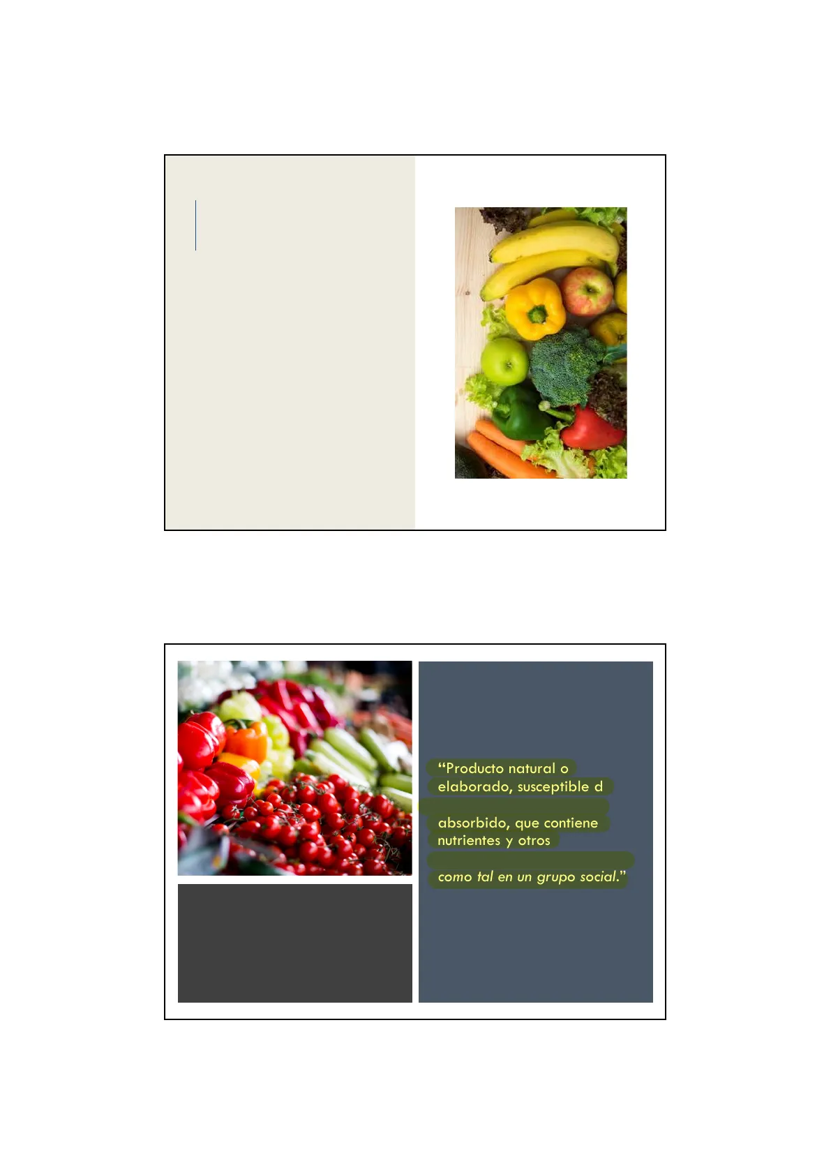115-08-2024 PRIMERA PARTE I. Primera parte 1. Alimento 2. Nutrientes a. Proteínas b. Lípidos c. Hidratos de Carbono d. Vitaminas e. Minerales "Producto natural o elaborado, susceptible de ser ingerido, digerido y absorbido, que contiene nutrientes y otros componentes, y es reconocido como tal en un grupo social." 1. ¿ QUÉ ES UN ALIMENTO ? Glosario de términos, FAO Académico Jessica Moya Tillería, Nutricionista, PhD (c) Filosofía y Magister en Alimentos Saludables.