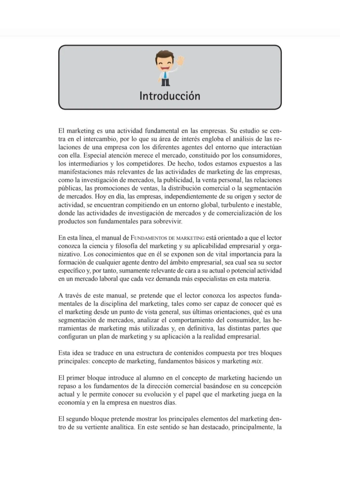 En esta línea, el manual de FUNDAMENTOS DE MARKETING está orientado a que el lector conozca la ciencia y filosofía del marketing y su aplicabilidad empresarial y orga- nizativo. Los conocimientos que en él se exponen son de vital importancia para la formación de cualquier agente dentro del ámbito empresarial, sea cual sea su sector específico y, por tanto, sumamente relevante de cara a su actual o potencial actividad en un mercado laboral que cada vez demanda más especialistas en esta materia.