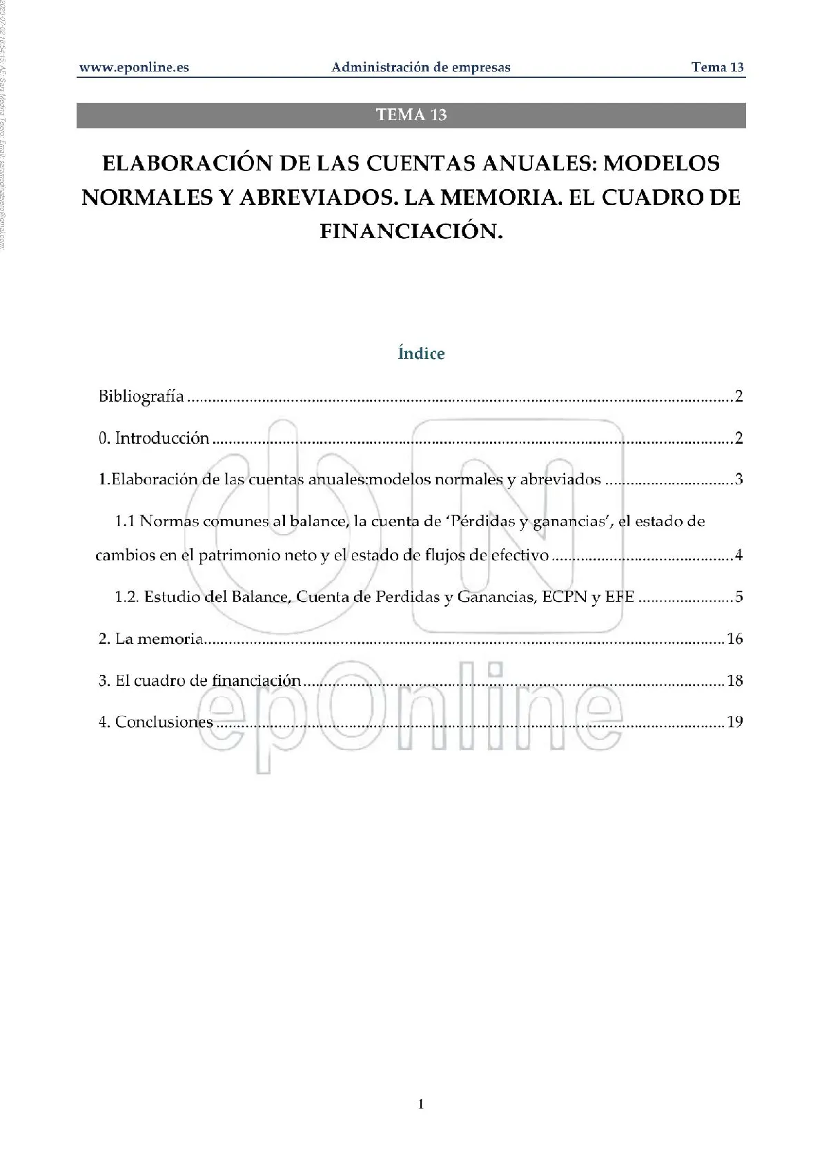 TEMA 13 ELABORACIÓN DE LAS CUENTAS ANUALES: MODELOS NORMALES Y ABREVIADOS. LA MEMORIA. EL CUADRO DE FINANCIACIÓN. Índice Bibliografía 2 0. Introducción 2 1.Elaboración de las cuentas anuales:modelos normales y abreviados .... 3 1.1 Normas comunes al balance, la cuenta de 'Pérdidas y ganancias', el estado de cambios en el patrimonio neto y el estado de flujos de efectivo 4 1.2. Estudio del Balance, Cuenta de Perdidas y Ganancias, ECPN y EFE ............. 5 2. La memoria. 16 3. El cuadro de financiación 18 4. Conclusiones epOnline 1 2023-07-02 18:54:15: AE: Sam Medina Tejero: Email: saramedinatejero@gmail.com;Tema 13 Administración de empresas www.eponline.es