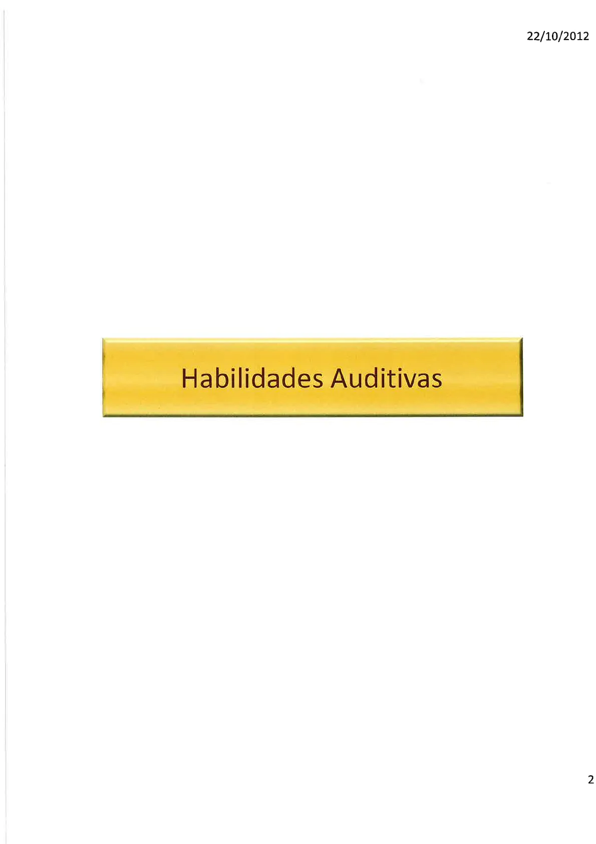 Diapositivas sobre Habilidades Auditivas. El Pdf explora la percepción auditiva como un proceso complejo de identificación y organización de información. El material, útil para estudiantes universitarios, describe las fases clave de intervención para el desarrollo de habilidades auditivas, incluyendo detección, discriminación, comprensión e identificación del sonido.