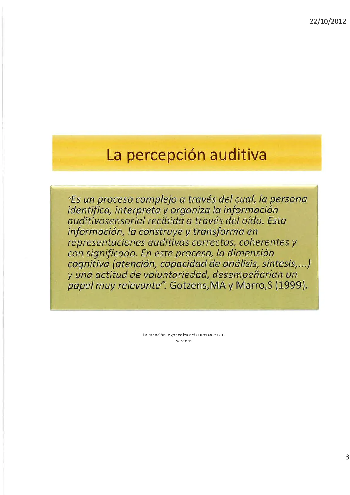 "Es un proceso complejo a través del cual, la persona identifica, interpreta y organiza la información auditivosensorial recibida a través del oído. Esta información, la construye y transforma en representaciones auditivas correctas, coherentes y con significado. En este proceso, la dimensión cognitiva (atención, capacidad de análisis, síntesis, ... ) y una actitud de voluntariedad, desempeñarían un papel muy relevante". Gotzens,MA y Marro,S (1999). La atención logopédica del alumnado con sordera 322/10/2012