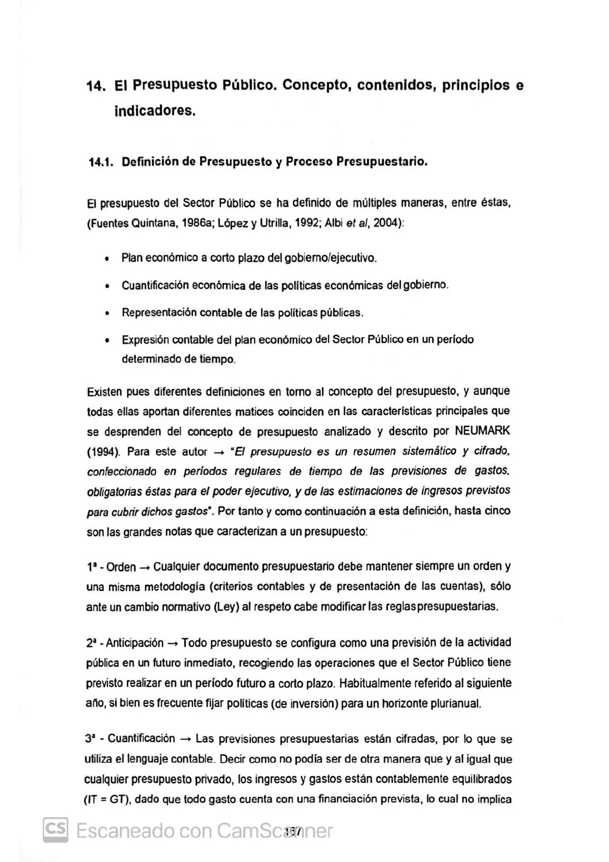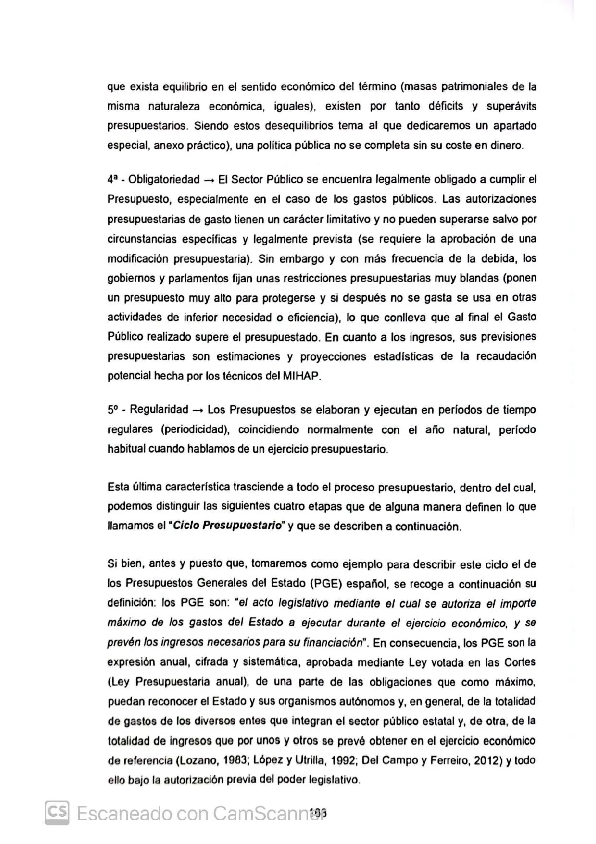1ª - Orden -+ Cualquier documento presupuestario debe mantener siempre un orden y una misma metodología (criterios contables y de presentación de las cuentas), sólo ante un cambio normativo (Ley) al respeto cabe modificar las reglas presupuestarias. 2ª - Anticipación -+ Todo presupuesto se configura como una previsión de la actividad pública en un futuro inmediato, recogiendo las operaciones que el Sector Público tiene previsto realizar en un período futuro a corto plazo. Habitualmente referido al siguiente año, si bien es frecuente fijar políticas (de inversión) para un horizonte plurianual. 3ª - Cuantificación - Las previsiones presupuestarias están cifradas, por lo que se utiliza el lenguaje contable. Decir como no podía ser de otra manera que y al igual que cualquier presupuesto privado, los ingresos y gastos están contablemente equilibrados (IT = GT), dado que todo gasto cuenta con una financiación prevista, lo cual no implica CS Escaneado con CamScannerque exista equilibrio en el sentido económico del término (masas patrimoniales de la misma naturaleza económica, iguales), existen por tanto déficits y superávits presupuestarios. Siendo estos desequilibrios tema al que dedicaremos un apartado especial, anexo práctico), una política pública no se completa sin su coste en dinero. 4ª - Obligatoriedad - El Sector Público se encuentra legalmente obligado a cumplir el Presupuesto, especialmente en el caso de los gastos públicos. Las autorizaciones presupuestarias de gasto tienen un carácter limitativo y no pueden superarse salvo por circunstancias específicas y legalmente prevista (se requiere la aprobación de una modificación presupuestaria). Sin embargo y con más frecuencia de la debida, los gobiernos y parlamentos fijan unas restricciones presupuestarias muy blandas (ponen un presupuesto muy alto para protegerse y si después no se gasta se usa en otras actividades de inferior necesidad o eficiencia), lo que conlleva que al final el Gasto Público realizado supere el presupuestado. En cuanto a los ingresos, sus previsiones presupuestarias son estimaciones y proyecciones estadísticas de la recaudación potencial hecha por los técnicos del MIHAP. 5º - Regularidad - Los Presupuestos se elaboran y ejecutan en períodos de tiempo regulares (periodicidad), coincidiendo normalmente con el año natural, período habitual cuando hablamos de un ejercicio presupuestario.