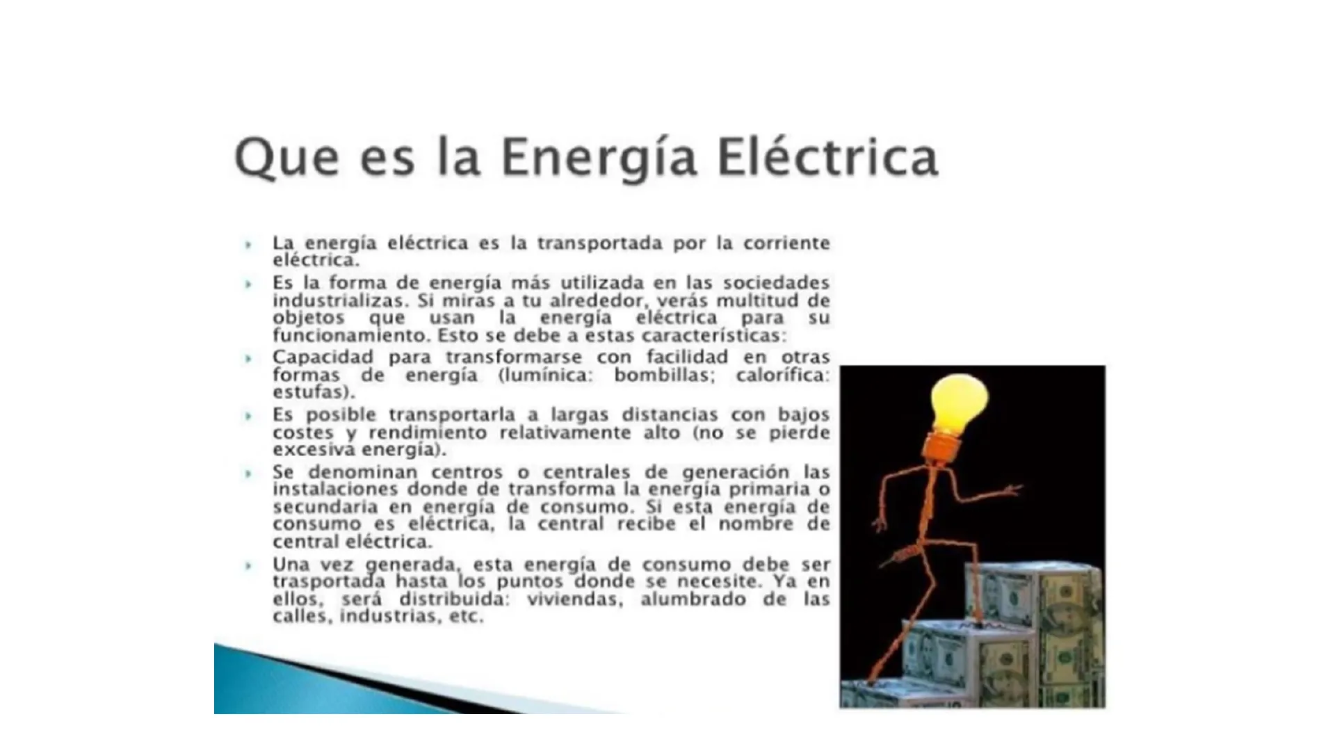 · La energía eléctrica es la transportada por la corriente eléctrica. › Es la forma de energía más utilizada en las sociedades industrializas. Si miras a tu alrededor, verás multitud de objetos que usan la energía eléctrica para su funcionamiento. Esto se debe a estas características: › Capacidad para transformarse con facilidad en otras formas de energía (lumínica: bombillas; calorífica: estufas). · Es posible transportarla a largas distancias con bajos costes y rendimiento relativamente alto (no se pierde excesiva energía). . Se denominan centros o centrales de generación las instalaciones donde de transforma la energía primaria o secundaria en energía de consumo. Si esta energía de consumo es eléctrica, la central recibe el nombre de central eléctrica. Una vez generada, esta energía de consumo debe ser trasportada hasta los puntos donde se necesite. Ya en ellos, será distribuida: viviendas, alumbrado de las calles, industrias, etc.