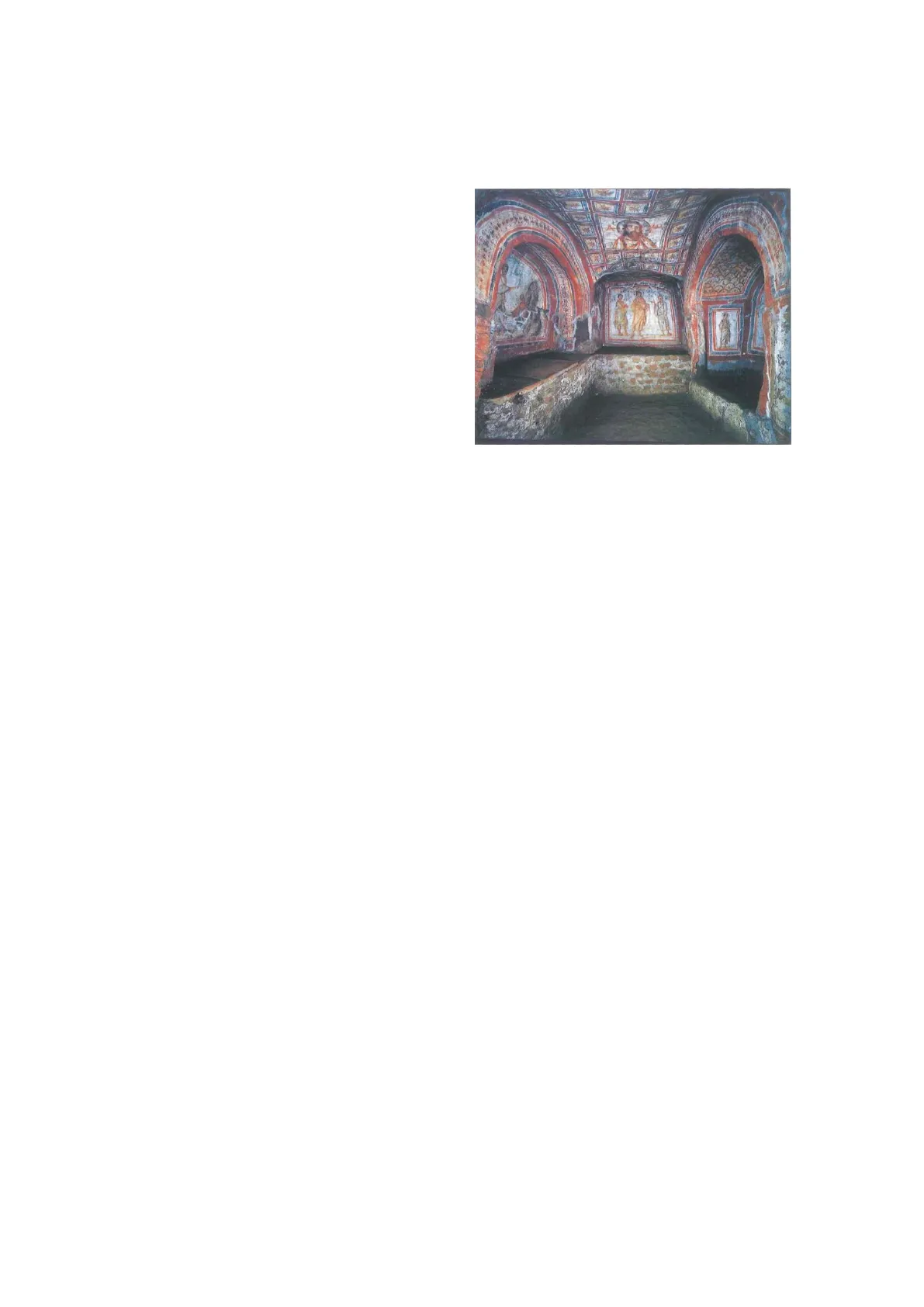 Las persecuciones que sufrían los seguidores de Jesucristo por reunirse en determinados lugares para poder practicar el culto sin ser descubiertos, los llevó a utilizar sus casas particulares, las cuales recibían el nombre de domus ecclesiae, siendo la más antigua la de Dura Europos en Siria, que data del siglo III. Otro edificio de la misma época es el martyrium, el cual era de pequeñas proporciones y de planta central, la cual albergaba la tumba de un mártir.Los ritos funerarios cristianos no aceptaban la cremación de los cadáveres, ya que preferían la inhumación. En ese sentido, hacia los siglos II y III se adquirieron unos terrenos a las afueras de Roma, convirtiéndose en el origen de las catacumbas que dejaron de utilizarse hacia finales del siglo V y comienzos del VI. En ellas se excavaron un conjunto de estrechas y altas galerías (ambulacra), en cuyas paredes se abren en sentido longitudinal unas cavidades rectangulares (locu- li), cerrados con losas de mármol o ladrillos, en donde se depositaban los cada- veres; los enterramientos situados en los lugares donde se cruzan varias de estas galerías (cubicula) presentan un nicho semicircular (arcosolium) bajo el que descansaba el cuerpo de algún mártir. En Roma se encuentran las catacumbas más importantes, entre las que se destacan las de San Calixto, San Sebastián., Santa Domitila, Santa Inés y Santa Priscila, aunque existen otras en Nápoles, Sicilia y el norte de África.