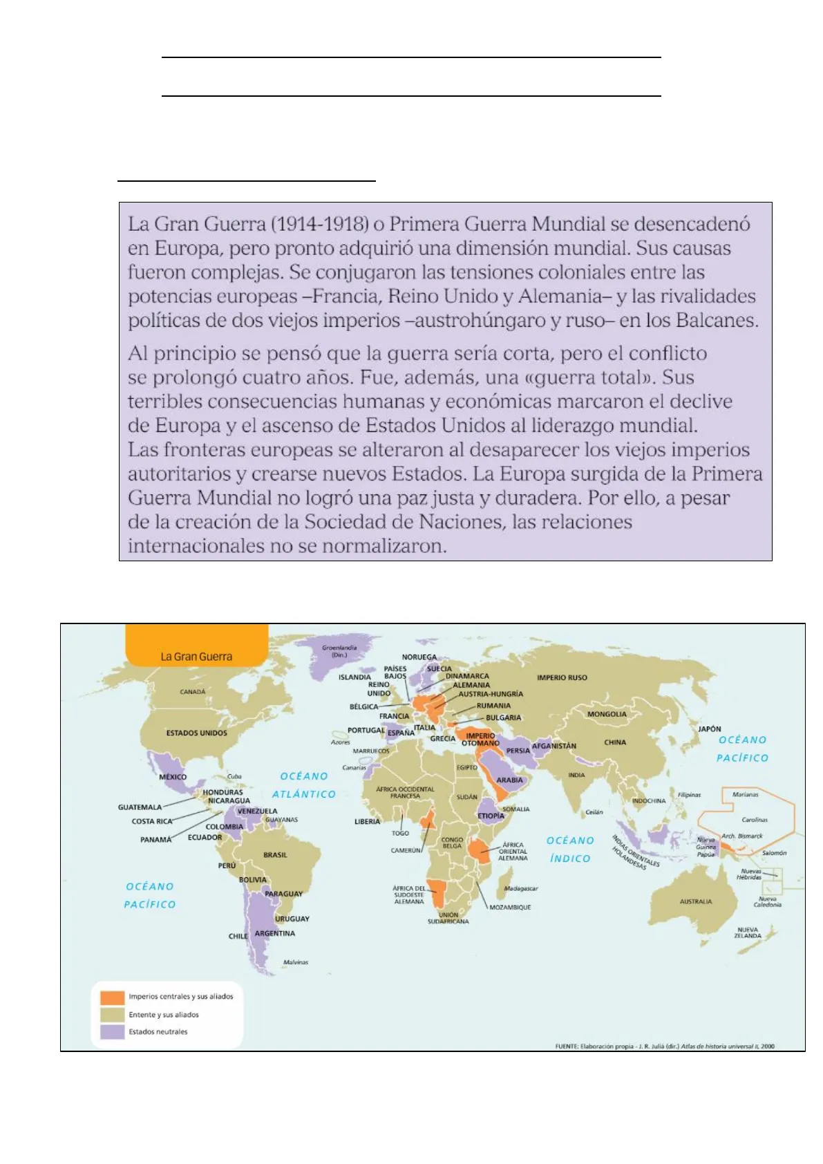 La Gran Guerra (1914-1918) o Primera Guerra Mundial se desencadenó en Europa, pero pronto adquirió una dimensión mundial. Sus causas fueron complejas. Se conjugaron las tensiones coloniales entre las potencias europeas -Francia, Reino Unido y Alemania- y las rivalidades políticas de dos viejos imperios -austrohúngaro y ruso- en los Balcanes. Al principio se pensó que la guerra sería corta, pero el conflicto se prolongó cuatro años. Fue, además, una «guerra total». Sus terribles consecuencias humanas y económicas marcaron el declive de Europa y el ascenso de Estados Unidos al liderazgo mundial. Las fronteras europeas se alteraron al desaparecer los viejos imperios autoritarios y crearse nuevos Estados. La Europa surgida de la Primera Guerra Mundial no logró una paz justa y duradera. Por ello, a pesar de la creación de la Sociedad de Naciones, las relaciones internacionales no se normalizaron.
