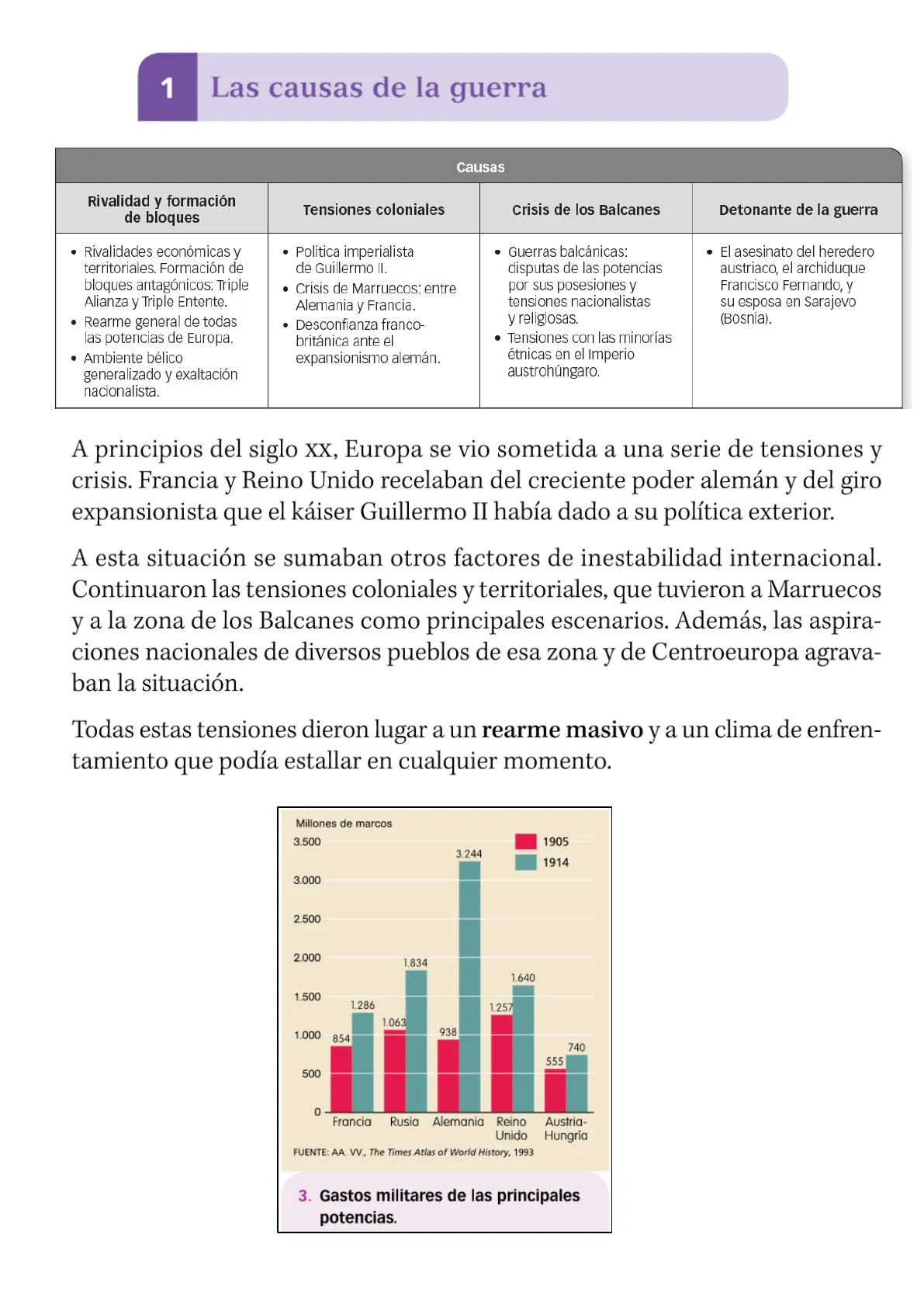 A principios del siglo xx, Europa se vio sometida a una serie de tensiones y crisis. Francia y Reino Unido recelaban del creciente poder alemán y del giro expansionista que el káiser Guillermo II había dado a su política exterior. A esta situación se sumaban otros factores de inestabilidad internacional. Continuaron las tensiones coloniales y territoriales, que tuvieron a Marruecos y a la zona de los Balcanes como principales escenarios. Además, las aspira- ciones nacionales de diversos pueblos de esa zona y de Centroeuropa agrava- ban la situación. Todas estas tensiones dieron lugar a un rearme masivo y a un clima de enfren- tamiento que podía estallar en cualquier momento.