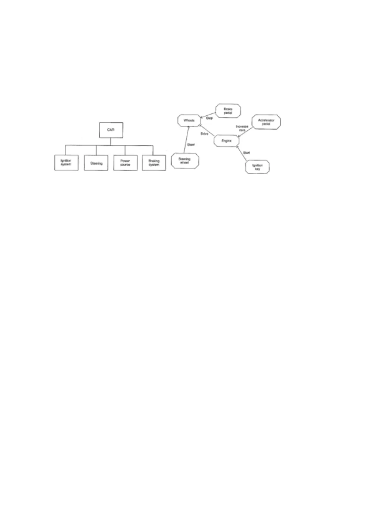 Tras el SAAD surge el Análisis y el Diseño Orientado a Objetos. Este se centra principalmente de abajo hacia arriba y se enfoca en las entidades que forman un sistema, no en sus funciones. En el dominio de IS los datos y funciones están altamente relacionados. El énfasis está centrado enla abstracción de datos. Se piensa de forma natural, la especificación de los objetos, con sus datos, se mapean/vinculan a entidades del mundo real o de las ideas. El lenguaje de modelado utilizado es el UML. A continuación, se observa la diferencia entre el SAAD y el OOAD. En el primero el coche se conceptualiza como bloques de funciones, mientras que en el segundo se ve tanto los objetos que lo forman como sus interacciones. Ersice Dedai Saop Whoels Accelerator Dedal CAR Ergine Ignition system Power Steering wheel Sweering Braking system Ignition key