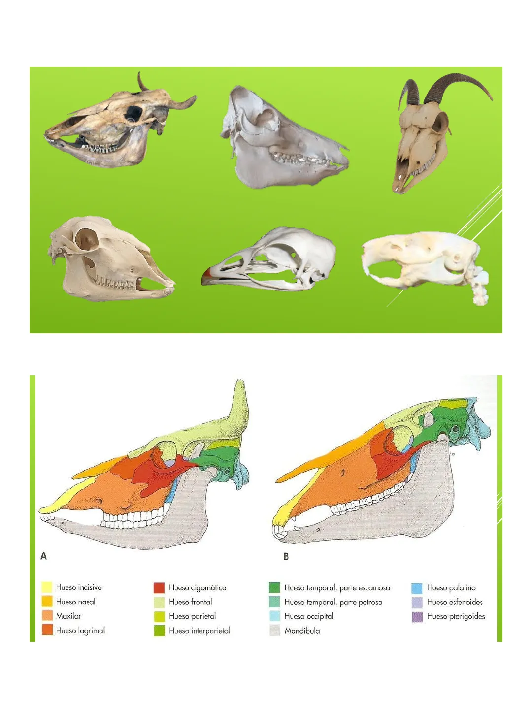 A B Hueso incisivo Hueso cigomático Hueso temporal, parte escamosa Hueso palatino Hueso nasal Hueso frontal Hueso temporal, parte petrosa Hueso esfenoides Maxilar Hueso parietal Hueso occipital Hueso pterigoides Hueso lagrimal Hueso interparietal Mandíbula 218/12/2023