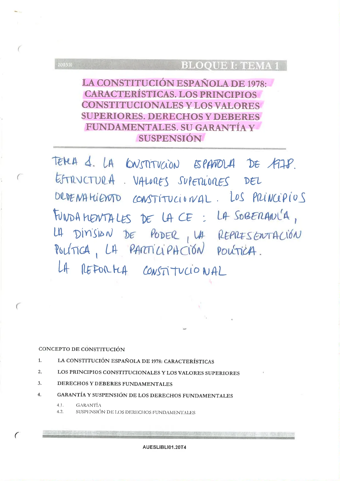 LA CONSTITUCIÓN ESPAÑOLA DE 1978: CARACTERÍSTICAS. LOS PRINCIPIOS CONSTITUCIONALES Y LOS VALORES SUPERIORES. DERECHOS Y DEBERES FUNDAMENTALES. SU GARANTÍA Y SUSPENSIÓN