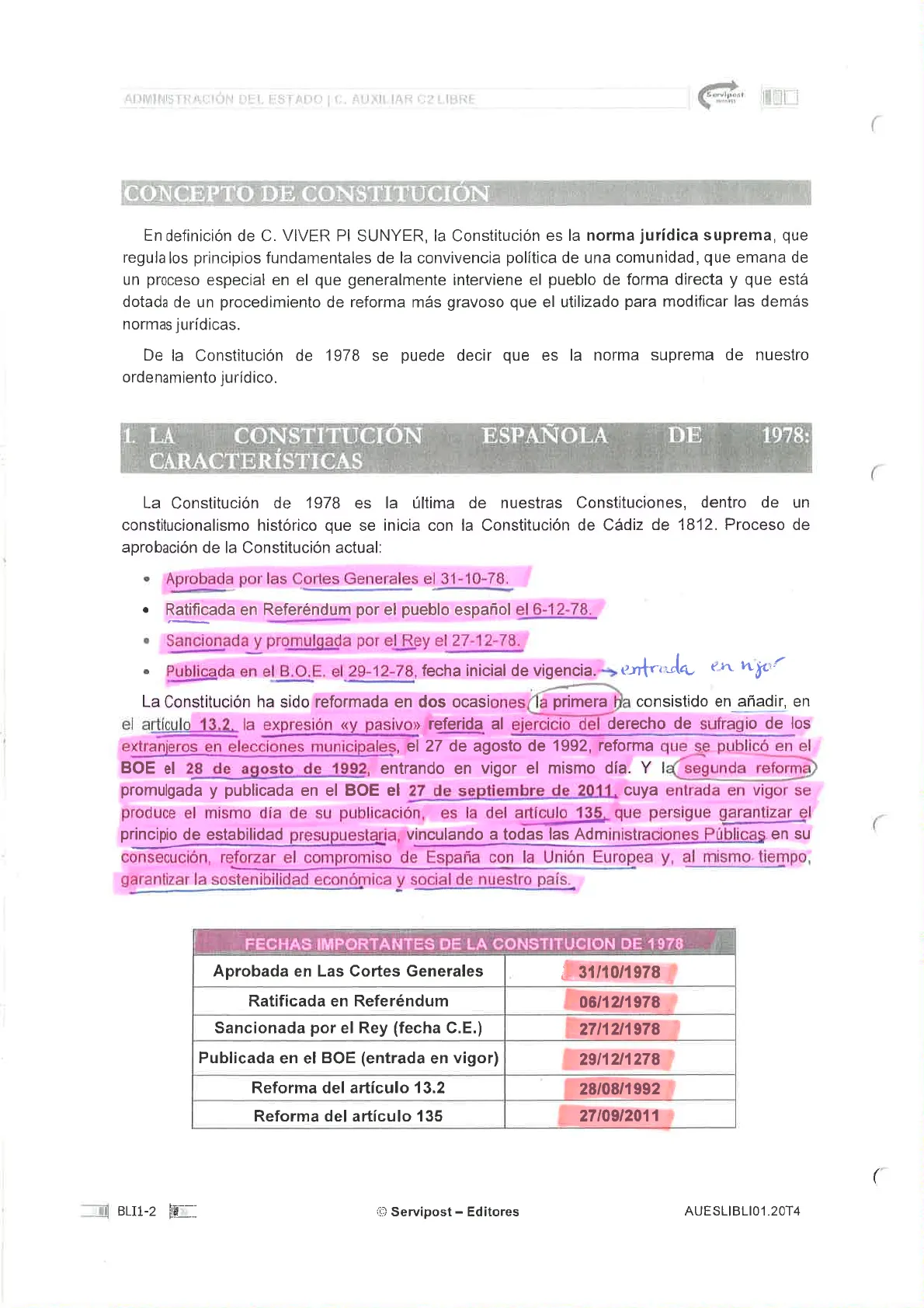 En definición de C. VIVER PI SUNYER, la Constitución es la norma jurídica suprema, que regula los principios fundamentales de la convivencia política de una comunidad, que emana de un proceso especial en el que generalmente interviene el pueblo de forma directa y que está dotada de un procedimiento de reforma más gravoso que el utilizado para modificar las demás normas jurídicas. De la Constitución de 1978 se puede decir que es la norma suprema de nuestro ordenamiento jurídico.
