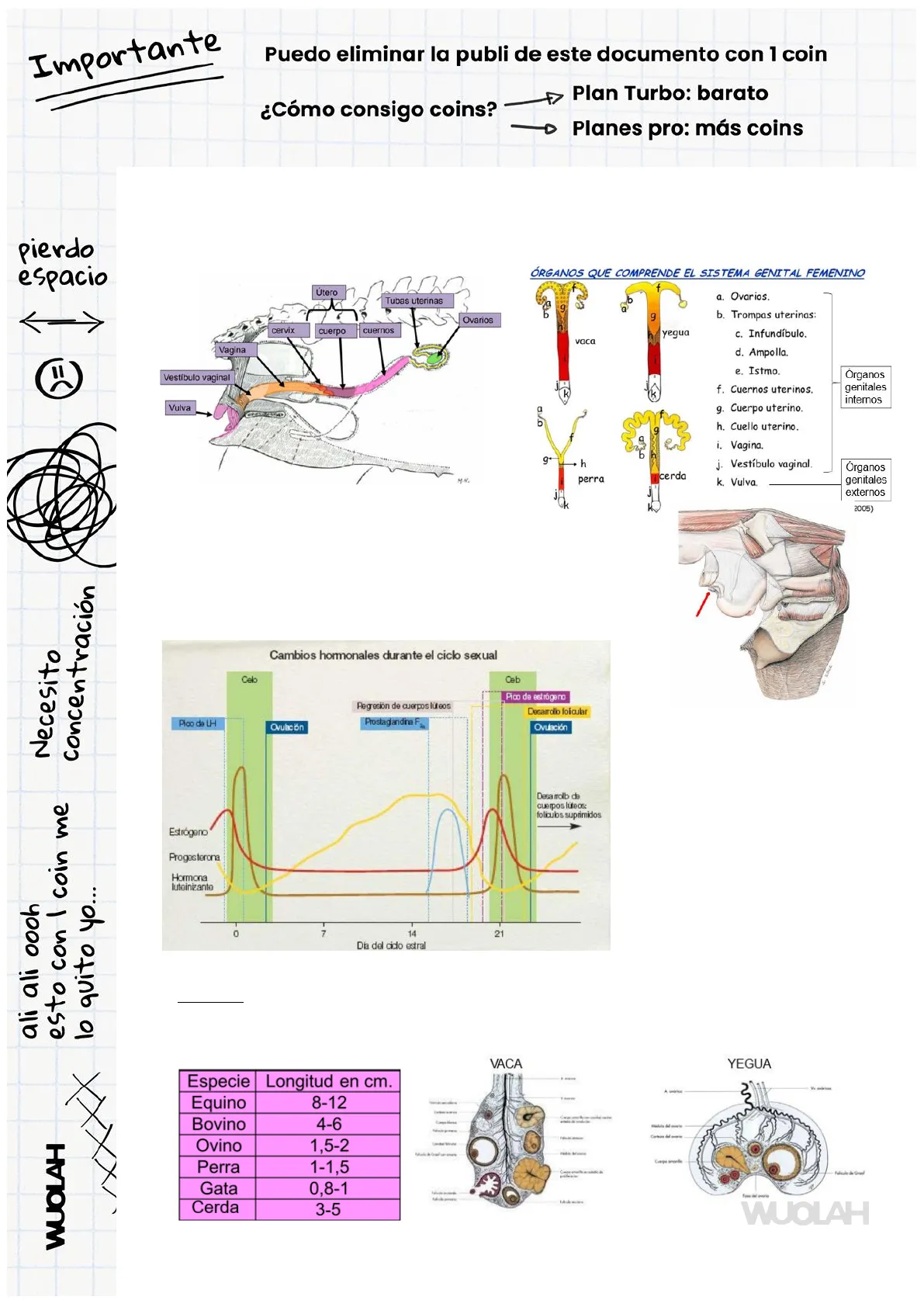 Vista dorsal da pelve óssea e sua relação com os órgão genitais femininos EQUINO BOVINO 5 2 6 7 -8 4 9 10 1) Túber Coxal 6) Corno Uterino 1) Ovário 2) Cérvix 2) Túber Sacral 7) Corpo Uterino 3) Túber Isquiático 8) Cérvix 4) Forame Obturado 9) Vagina 5) Ovário 10) Vulva DYCE, KM; SACK, WO; WENSING, CJG: 2010. WUOLAH 1 descarga sin publicidad = 1 coin Reservados todos los derechos. No se permite la explotación económica ni la transformación de esta obra. Queda permitida la impresión en su totalidad. b. Tamaño: c. Peso: / 70 a 80 g. d. Situación: Mitad del borde lateral en la entrada de la cavidad pélvica. a. Forma:Imagínate aprobando el examen Necesitas tiempo y concentración