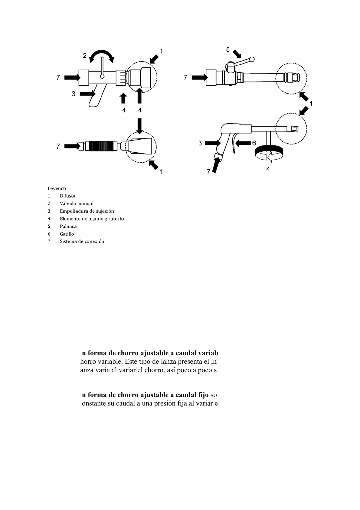 Leyenda 1 Difusor 2 Válvula manual 3 Empuñadura de sujeción 4 Elemento de mando giratorio 5 Palanca 6 Gatillo 7 Sistema de conexión