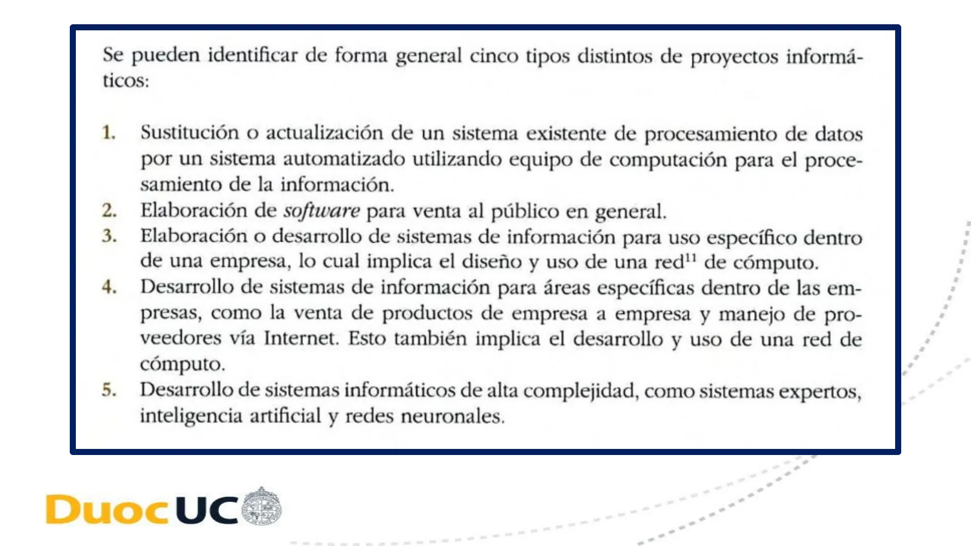Sigla GPY5101: EVALUACION DE PROYECTOS INFORMÁTICOS MALETA DIDACTICASe pueden identificar de forma general cinco tipos distintos de proyectos informá- ticos: