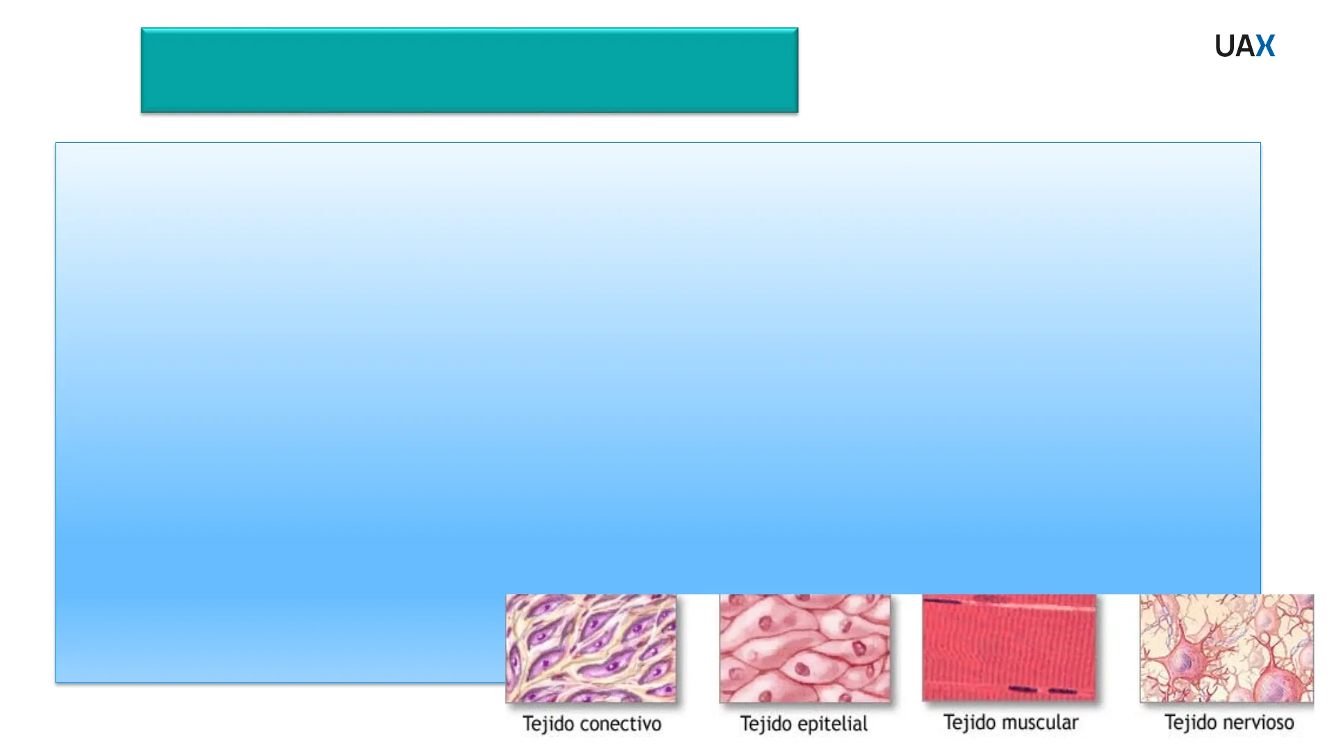 UAX · Estudio de la composición y estructura microscópica de los tejidos orgánicos. · Un tejido es una agrupación de células similares, que realizan una función común. En la mayoría de los tejidos hay una sustancia entre las células llamada matriz extracelular. · Los órganos están formados por distintos tipos de tejidos. La mayor parte de los órganos tienen dos componentes: parénquima (conjunto de células responsables de las funciones típicas del órgano) y estroma (tejido de sostén). · Hay cuatro tipos de tejidos: - Epitelial: deriva de las tres capas del embrión (ectodermo, mesodermo y endodermo) - Conjuntivo o conectivo: deriva del mesodermo - Muscular: deriva del mesodermo - Nervioso: deriva del ectodermo