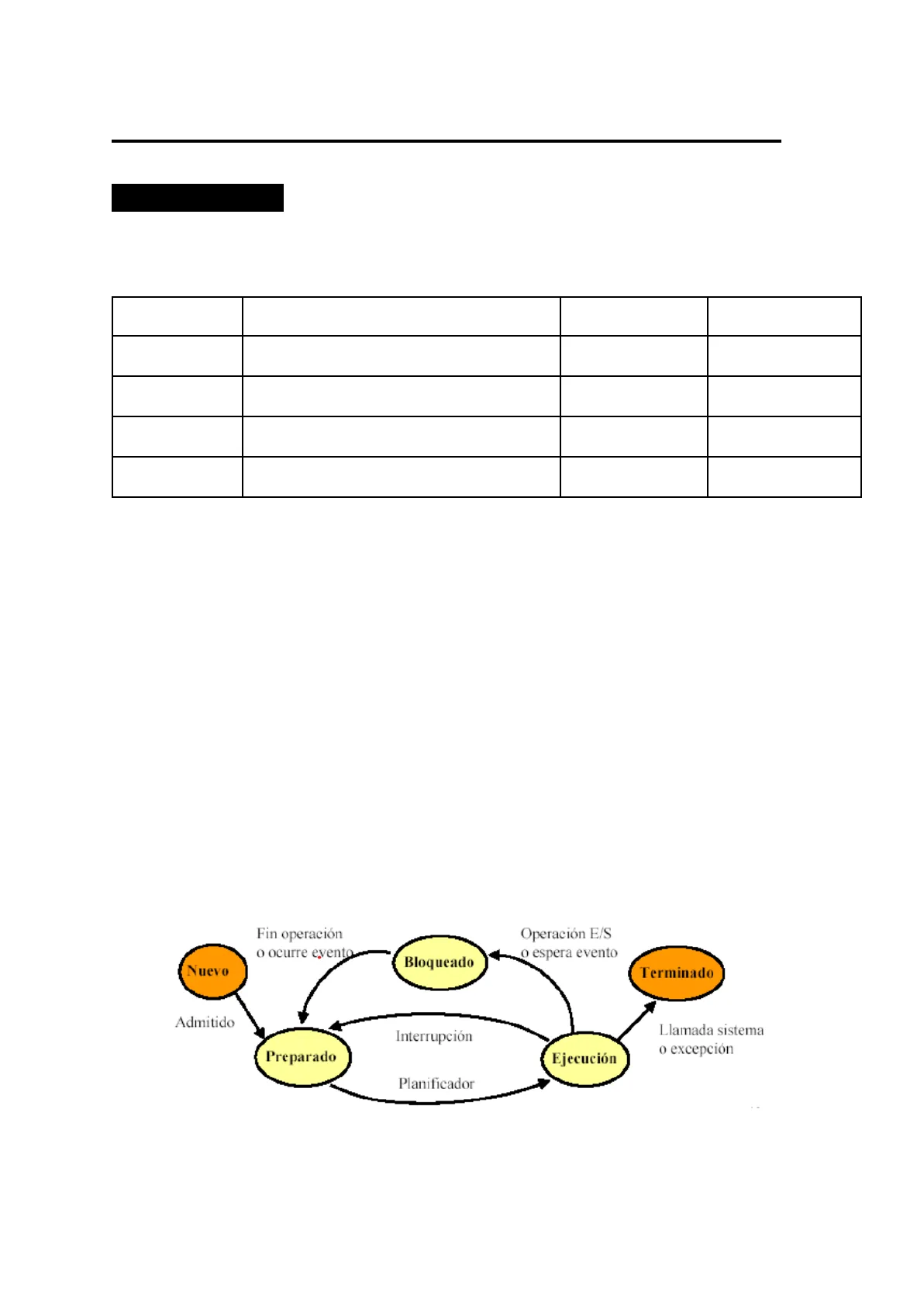 3.Dibujar un gráfico que indique los estados posibles de un proceso, y con flechas de un único sentido las posibles transiciones. Indica que evento o acción produce la transición. Fin operación o ocurre evento- Operación E/S o espera evento Bloqueado Nuevo Terminado Admitido Interrupción Llamada sistema o excepción Preparado Ejecución Planificador