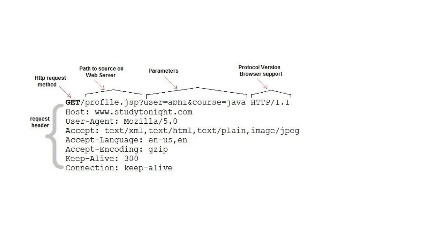 Path to source on Web Server Parameters Protocol Version Browser support Http request method GET/profile.jsp?user=abhi&course=java HTTP/1.1 Host: www.studytonight.com request header User-Agent: Mozilla/5.0 Accept: text/xml, text/html, text/plain, image/jpeg Accept-Language: en-us, en Accept-Encoding: gzip Keep-Alive: 300 Connection: keep-alive Lo usamos para obtener un fichero Html, texto, imagen, etc.GET
