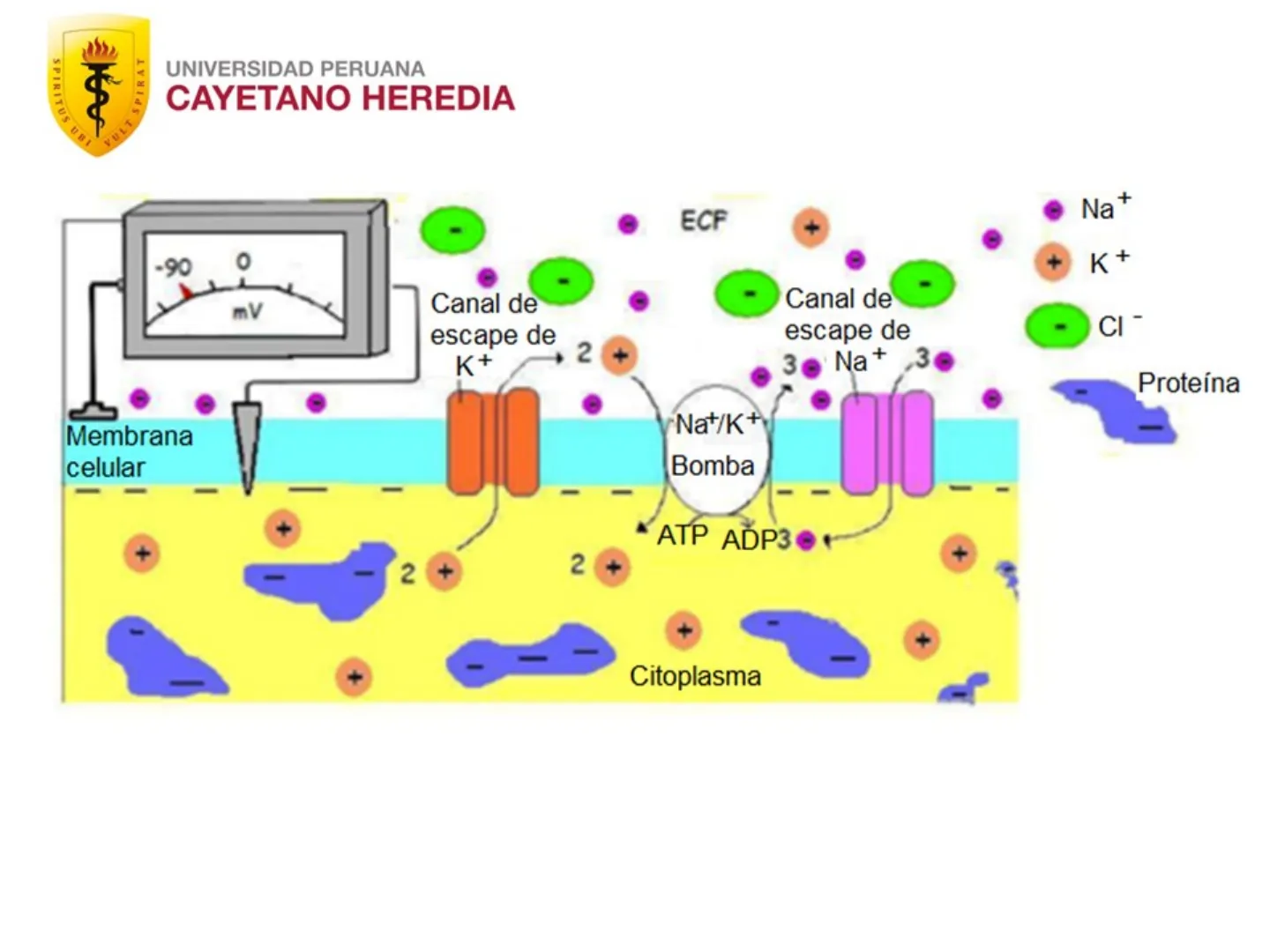 RT V -- In zF Go Ci donde V = potencial de equilibrio en voltios (potencial interno menos potencial externo) Co y Ci = Concentraciones de ion afuera y adentro, respectivamente R = La constante de los gases (2 cal mol -1 -1 K ) T = La temperatura absoluta (K) -1 -1 F = Constante de Faraday (2.3x104cal V mol ) z = la valencia (carga) del ion In = logaritmo de base eEn estado de reposo la cara citosólica es negativa