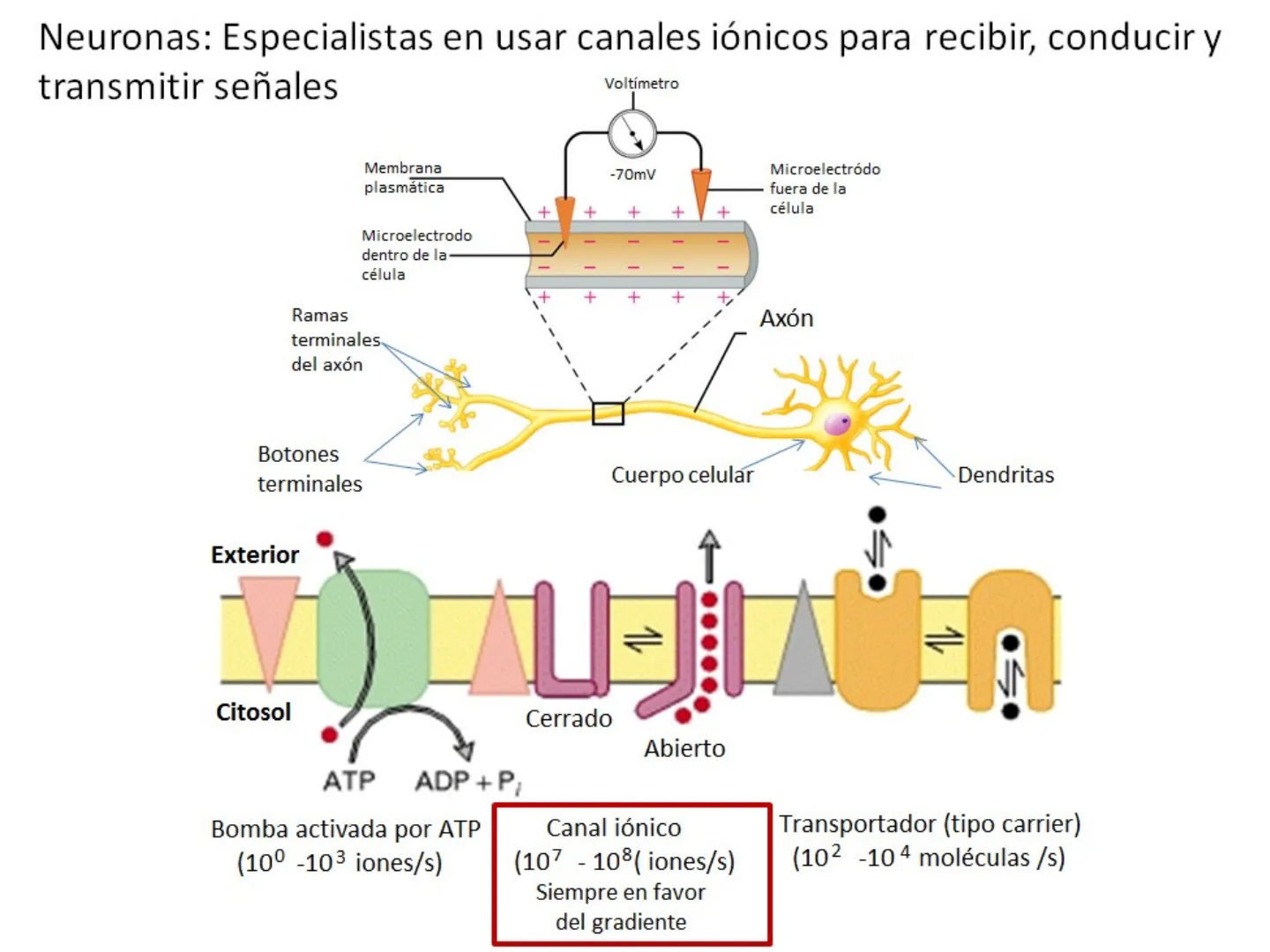 Voltímetro Membrana plasmática -70mV Microelectrodo fuera de la célula ++ + + + + Microelectrodo dentro de la célula - - - - - + + + Ramas terminales del axón Axón 1 1 1 1 Botones terminales Cuerpo celular Dendritas Exterior 1L . Citosol Cerrado Abierto ATP ADP + P/ Bomba activada por ATP (10º -103 iones/s) Canal iónico (107 - 108( iones/s) Siempre en favor del gradiente Transportador (tipo carrier) (102 -10 4 moléculas /s)
