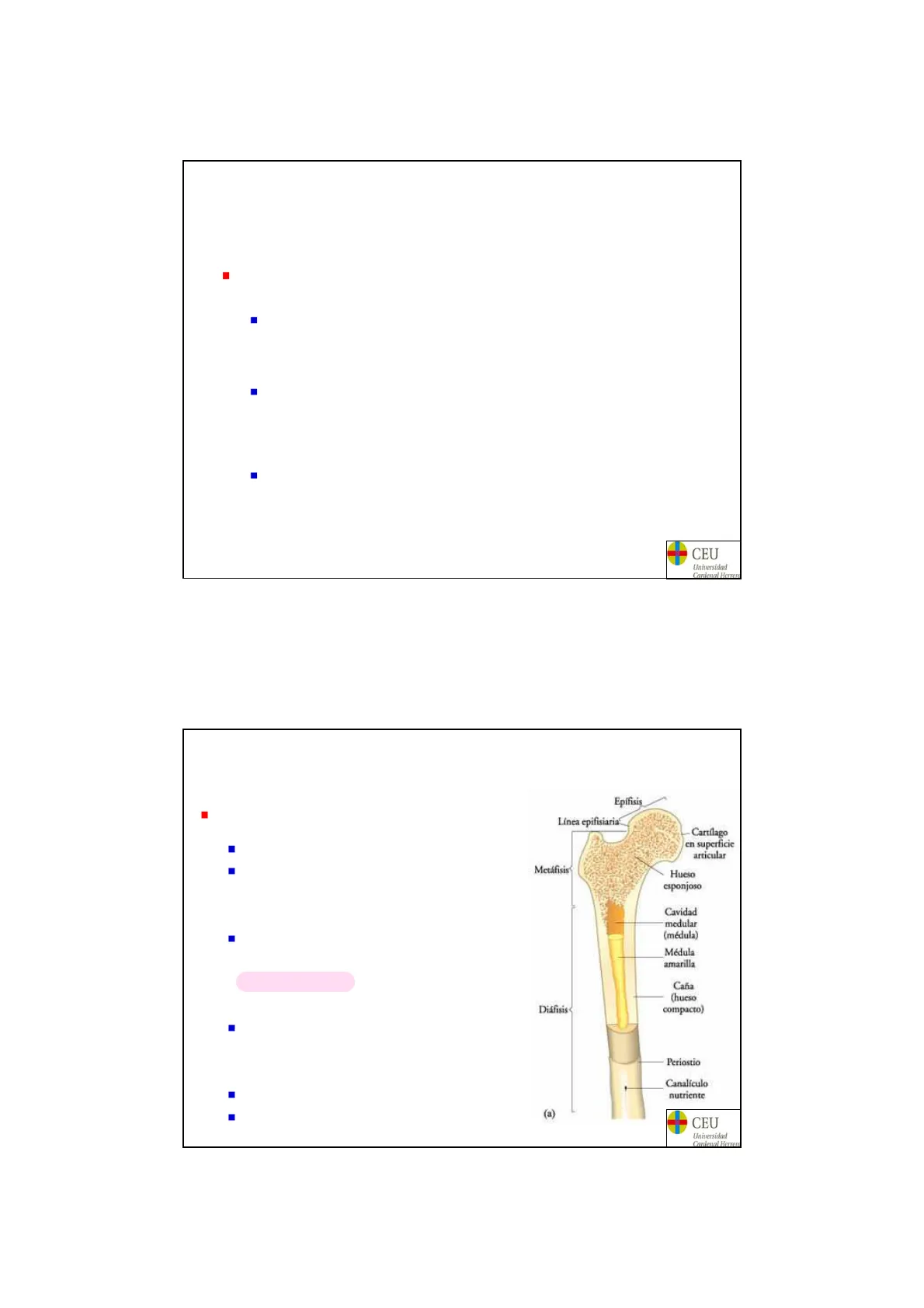 • Estructura de los huesos largos: Línea epifisiaria Cartílago en superficie articular Metáfisis Hueso esponjoso Cavidad medular (médula) Médula amarilla Caña (hueso compacto) Diáfisis Periostio Canalículo nutriente . Cavidad medular. (a) CEU Universidad Cardenal Herrer