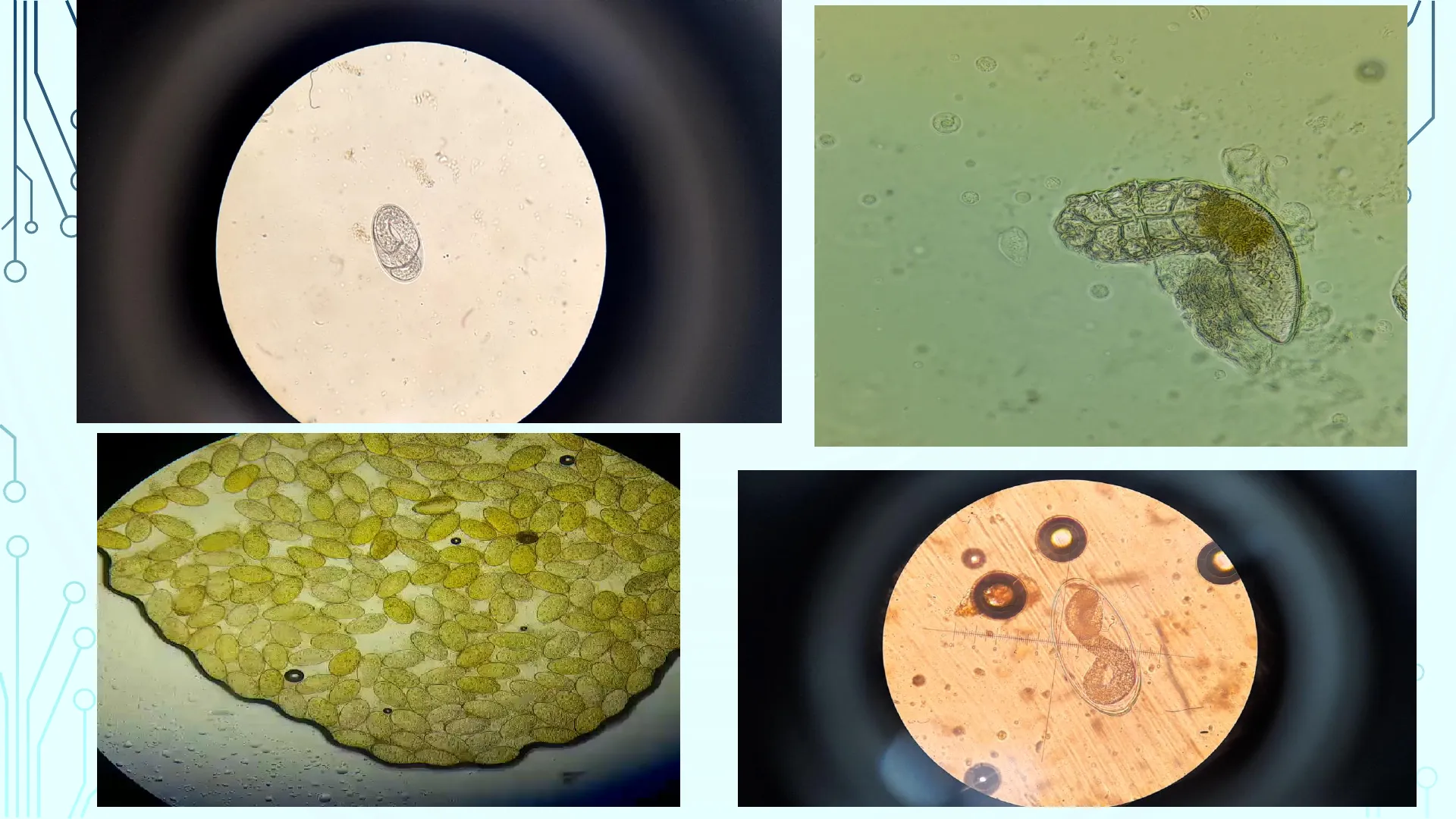 La etiología, en cuanto - situación o característica patológica, - Especificidad del hospedero,-Fase del efecto parasitario Localización y lesiones Fisiopatología, en cuanto a los grados y gravedad Diagnóstico con los métodos y sus limitaciones y bondades