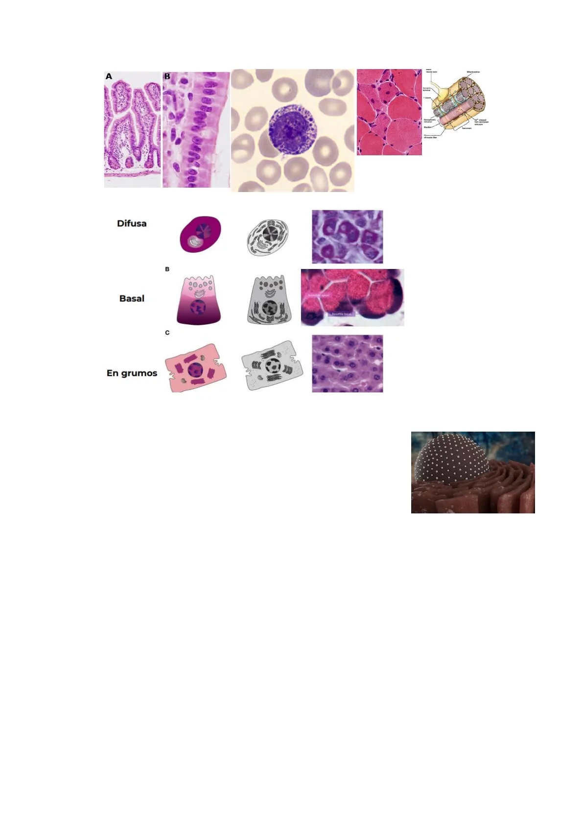 Hematoxilina es un colorante básico, que tiñe de azul o morado las estructuras ácidas, como el núcleo de la célula (donde está el ADN, que es ácido).A B Difusa B Basal Acidohis apical c En grumos