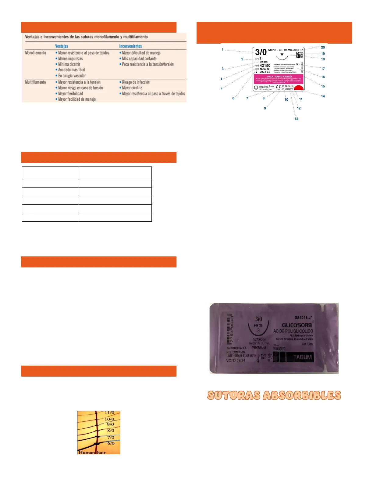 | Absorbible | Ácido poliglicólico | Multifilamento | 60-90 días | Suturas subcutáneas, ligaduras |