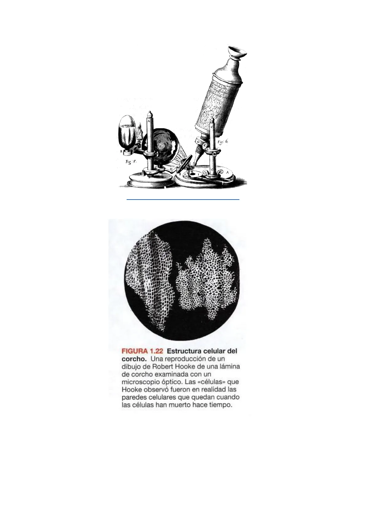 En 1665 Robert Hooke observó corcho con un microscopio óptico muy simple y pudo ver estructuras similares a cajas o celdas a las que llamó "células". Lo que en realidad vió fueron los de paredes celulares celulares del material vegetal secoFig: 6;