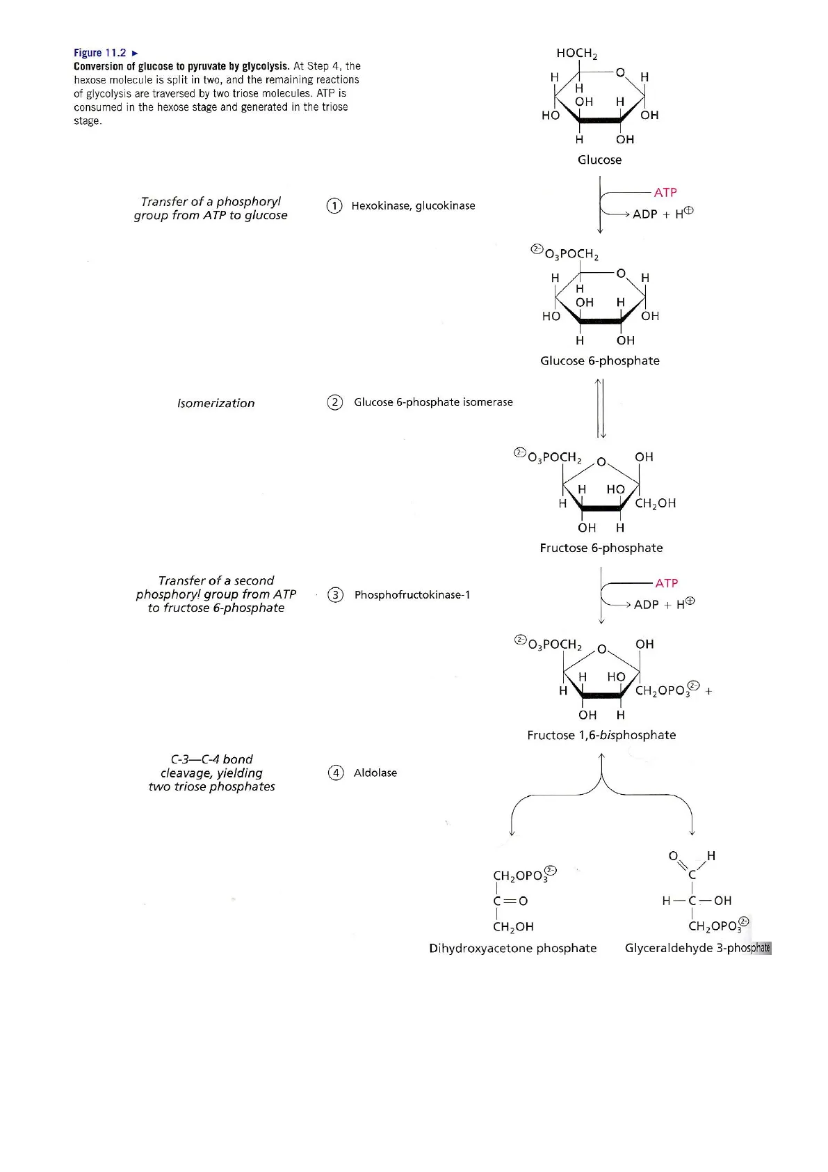 a) Fase de las hexosas: en la que la glucosa se prepara para su catabolismo. Consiste en la fosforilación de ésta y su transformación hasta fructosa 1,6-bisfosfato. En esta fase se consumen 2 ATP por cada molécula de glucosa.