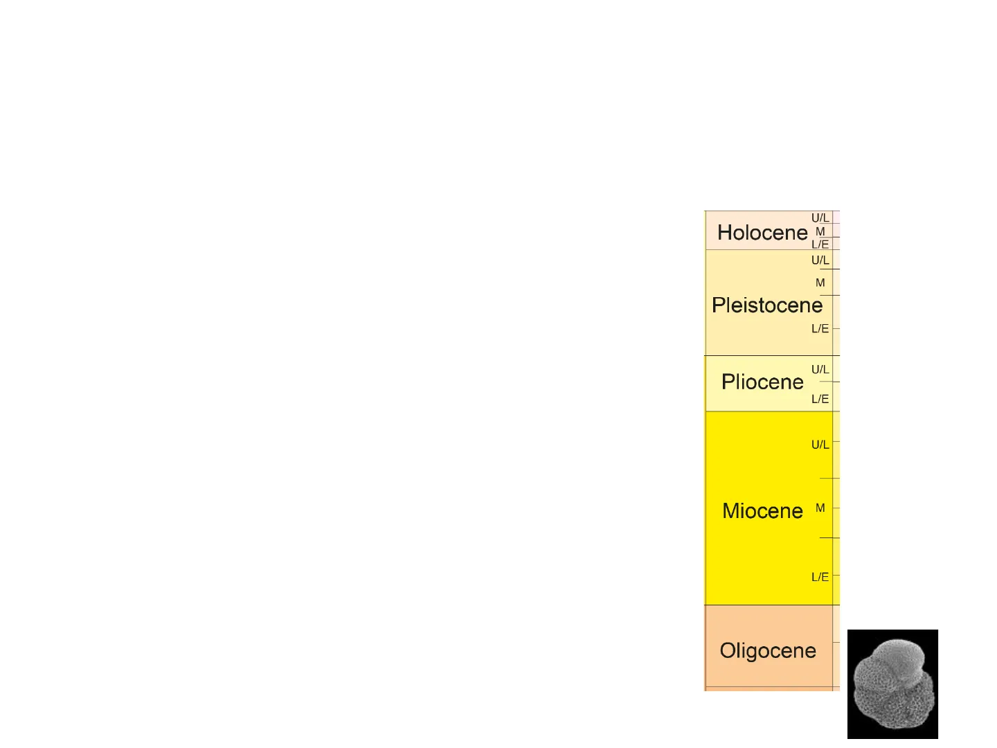 U/L Holocene M L/E U/L M Pleistocene L/E (2.40 Ma) U/L -- Comienzo de las glaciaciones cuaternarias Pliocene L/E (5.33 Ma) U/L -- Restablecimiento de condiciones marinas en el Mediterráneo Miocene M L/E (23.03 Ma) -- Aparición de G. kugleri OligoceneLa datación relativa