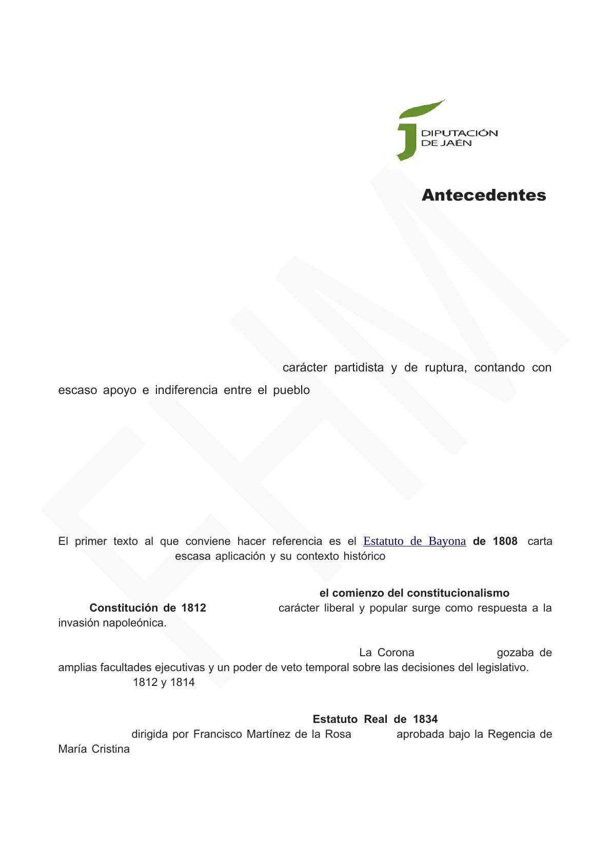 Documento de Diputación de Jaén sobre La Constitución Española de 1978. Antecedentes. El Pdf explora la historia constitucional española, incluyendo derechos y deberes fundamentales, y es útil para oposiciones de Derecho.