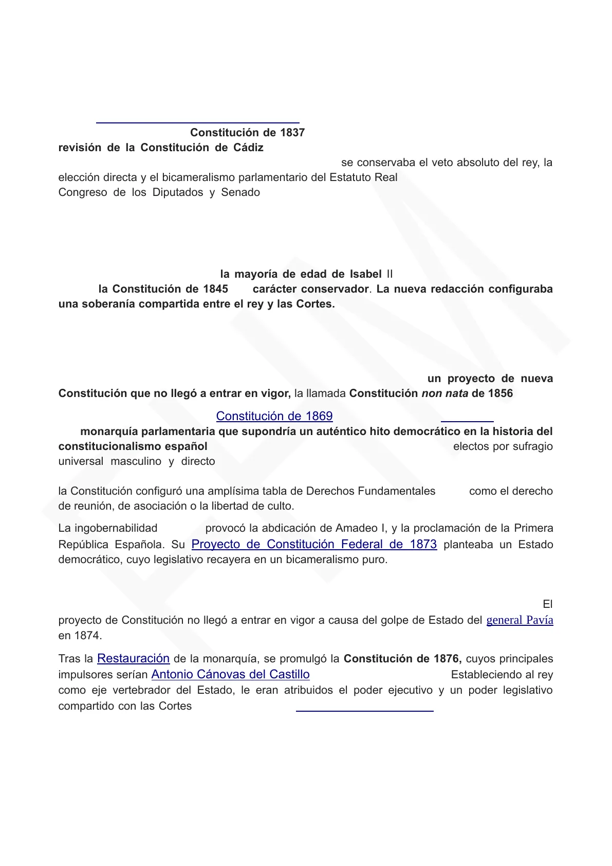 Tras la escasa aplicación práctica y observancia de la Constitución de 1837 por parte de los poderes públicos, y alcanzada la mayoría de edad de Isabel II, se decidió su reforma, dando lugar a la Constitución de 1845, de carácter conservador. La nueva redacción configuraba una soberanía compartida entre el rey y las Cortes. Se conservaba la división de poderes, con un legislativo bicameral en el que el Congreso se renovaba en pleno cada cinco años mediante sufragio censitario directo, mientras que el Senado se constituía mediante la elección regia de entre españoles de altísima renta y que estuviesen comprendidos entre una serie de altos cargos eclesiásticos, militares y civiles, o bien entre la alta nobleza. Se trata de un periodo inestable en el que la Constitución es frecuentemente reformada, llegando a haber un proyecto de nueva Constitución que no llegó a entrar en vigor, la llamada Constitución non nata de 1856.