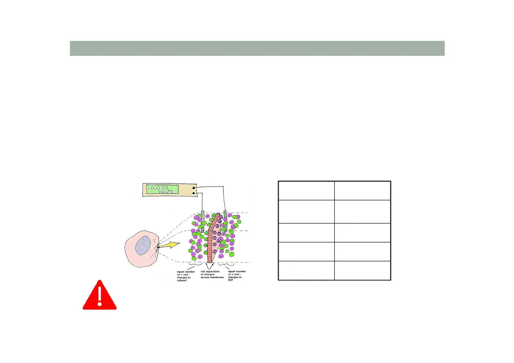 TABLE 5-3 Net Electrochemical Driving Forces Acting on Ions in a Typical Cell* EXTRACELLULAR CONCENTRATION INTRACELLULAR CONCENTRATION [X] MEMBRANE VOLTAGE Vm EQUILIBRIUM POTENTIAL (mV) Ex =- (RT/ZxF) In ([X];/[X].) ELECTROCHEMICAL DRIVING FORCE (Vm - Ex) Na+ 145 mM 15 mM -60 mV +61 mV -121 mV K+ 4.5 mM 120 mM -60 mV -88 mV +28 mV Ca2+ 1.2 mM 10-7 M -60 mV +125 mV -185 mV Cl- 116 mM 20 mM -60 mV -47 mV -13 mV HCO3 25 mM 16 mM -60 mV -12 mV -48 mV H+ 40 nM pH 7.4 63 nM 7.2 -60 mV -12 mV -48 mV Si se cambia la concentracion iónica externa de K+, cambiará el valor del potencial de equilibrio