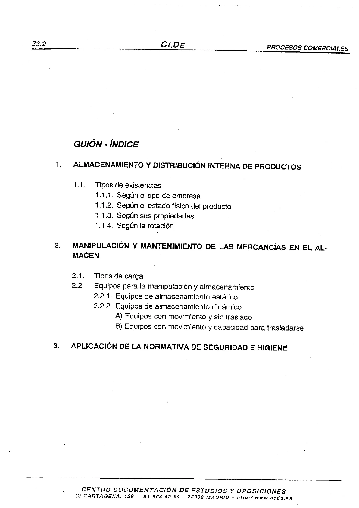 Alguno de los libros que figuran en este tema son comunes a toda la ma- teria de transporte y almacenaje, y se pueden considerar como manuales de uso de esta discipli- CENTRO DOCUMENTACIÓN DE ESTUDIOS Y OPOSICIONES C/ CARTAGENA. 129 - 91 564 47 04 - 28000 MANDIN _ http://www modo 00PROCESOS COMERCIALES CEDE 33.5 na, particularmente "Transporte Internacional de Mercancías" de Enríquez de Dios, que a pesar de la fecha de su publicación, constituye una referencia en todos los temas del transporte. Por su parte, el Instituto de Comercio Exterior, dentro de sus manuales, siempre incluye algunos capítulos dedicados al transporte y almacenaje, debido a la relación in- discutible del mismo con el comercio internacional. Se recomienda consultar en el propio ICEX su catálogo de publicaciones con el fin de manejar el último de los manuales al respecto, aunque los temas generales del transporte también pueden ser consultados en ediciones antiguas. También es importante consultar el Factbook de comercio exterior, pues uno de sus temas lo dedica al transporte y manipulación de productos. Recomendamos, asimismo al lector la visita a las páginas web recomen- dadas donde podrá encontrar numeroso artículos sobre profesionales del sector, con el fin de que obtenga una visión global de todo el proceso de almacenaje. CENTRO DOCUMENTACIÓN DE ESTUDIOS Y OPOSICIONES C/ CARTAGENA, 129 - 91 564 42 94 - 28002 MADRID - http://www.cede.es33.6 CEDE