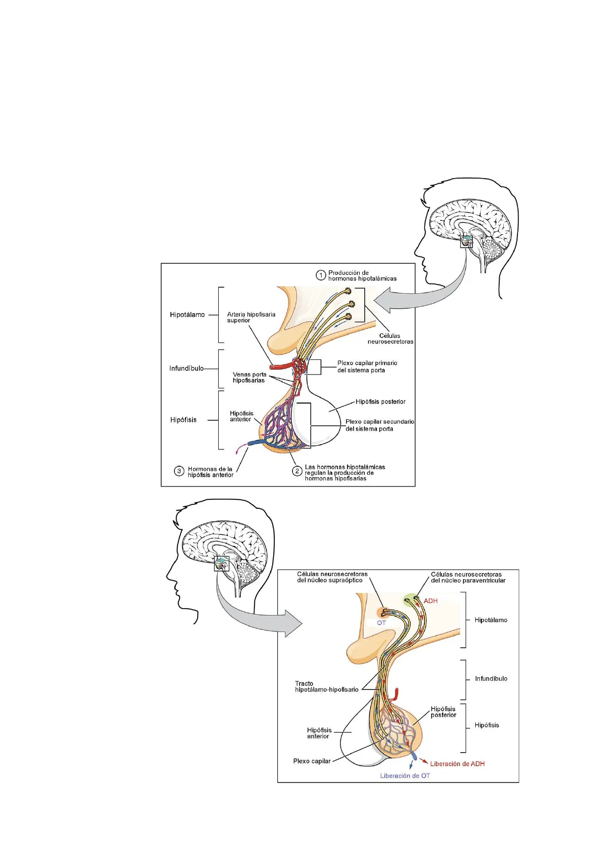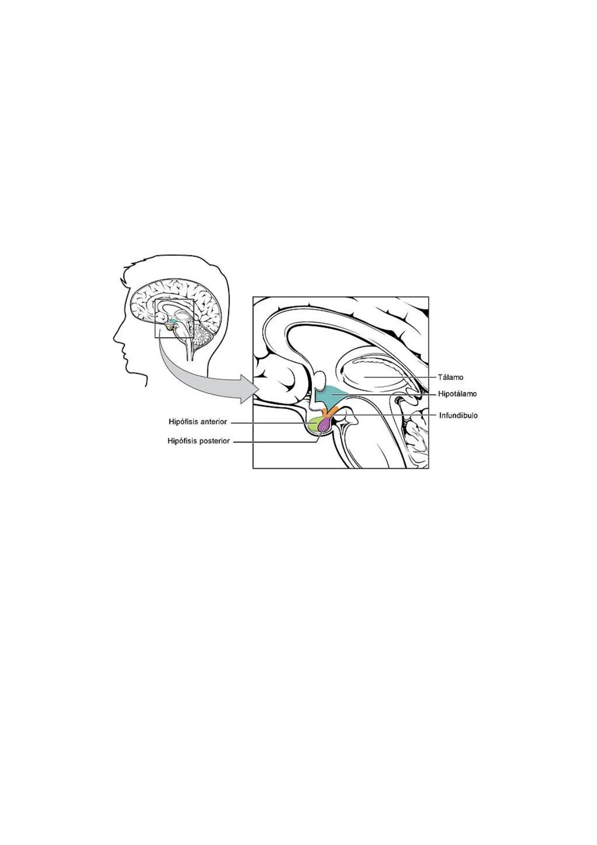 • Neurohipófisis o hipófisis posterior: reservorio de 2 hormonas sintetizadas en el hipotálamo. o ADH o arginina vasopresina o argipresina: reabsorbe agua en el túbulo colector. o Oxitocina: provoca contracciones del útero en el parto y produce el reflejo de eyección de la leche cuando se estimula el pezón.