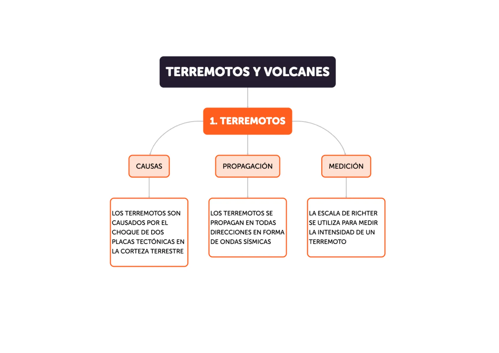Esquemas de ESO (Educación Secundaria Obligatoria) sobre Terremotos y Volcanes. Los resúmenes presentan mapas conceptuales detallados sobre terremotos, volcanes, contaminación atmosférica y clima, ideales para el estudio de Ciencias.