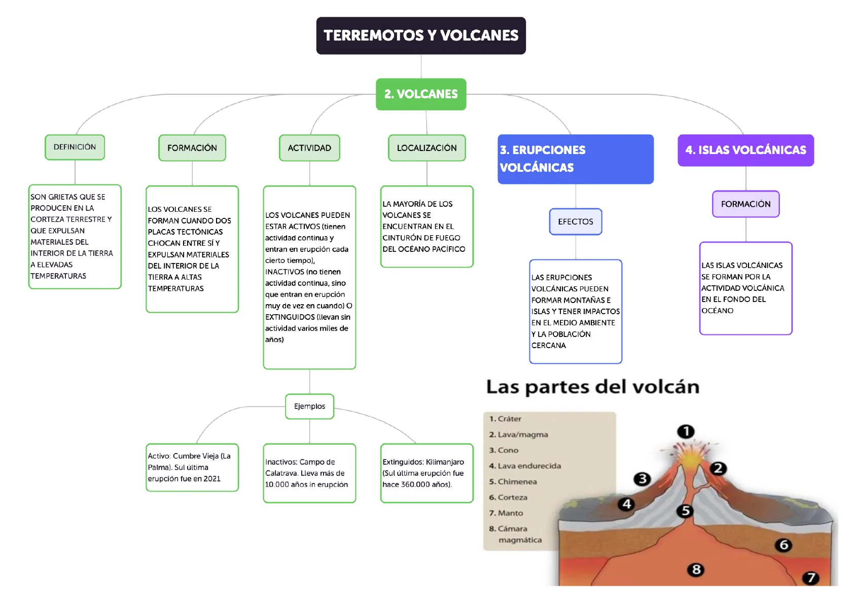 Ejemplos Activo: Cumbre Vieja (La Palma). Sul última erupción fue en 2021 Inactivos: Campo de Calatrava. Lleva más de 10.000 años in erupción Extinguidos: Kilimanjaro (Sul última erupción fue hace 360.000 años).