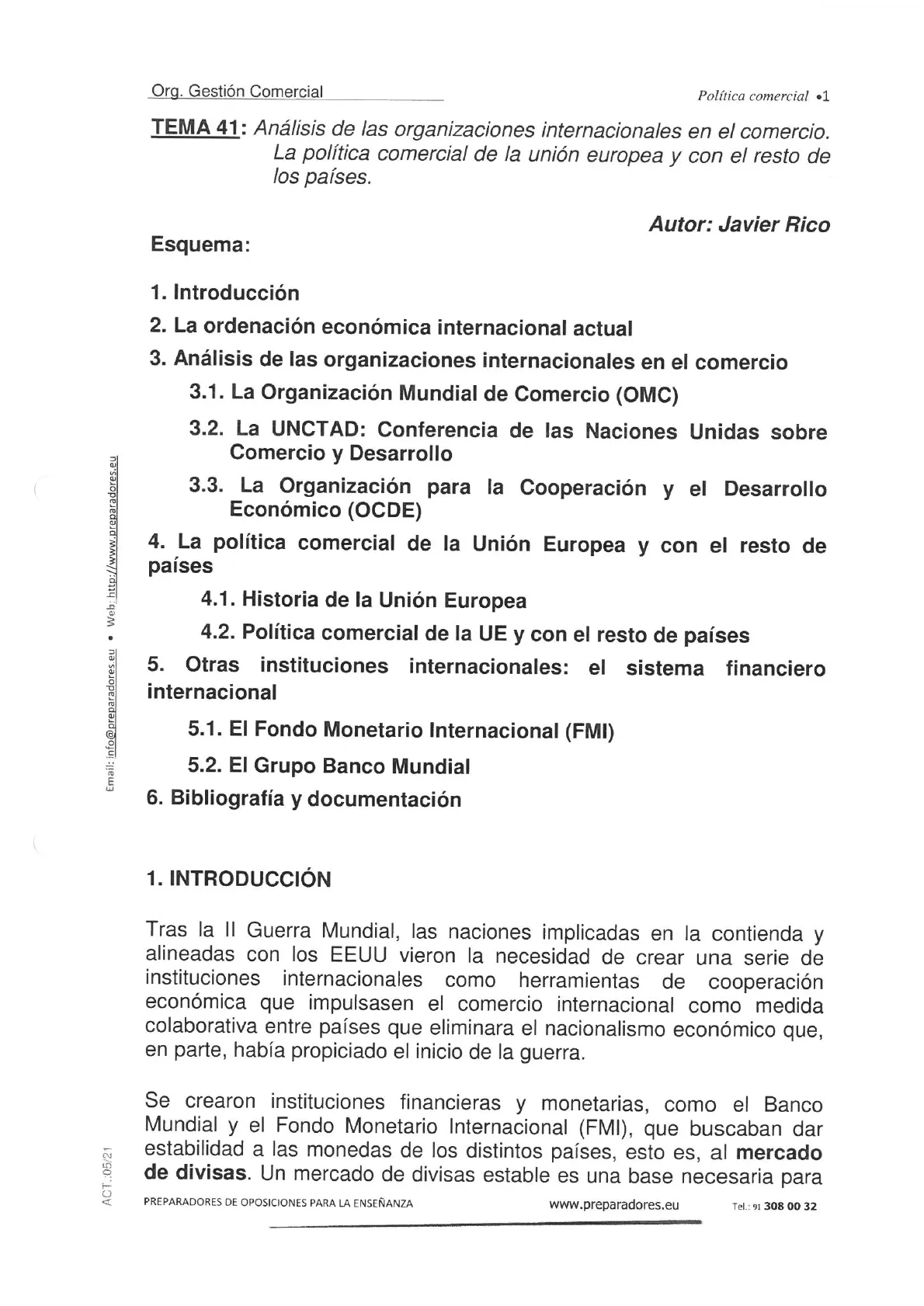 Política comercial ·1 TEMA 41: Análisis de las organizaciones internacionales en el comercio. La política comercial de la unión europea y con el resto de los países. Autor: Javier Rico