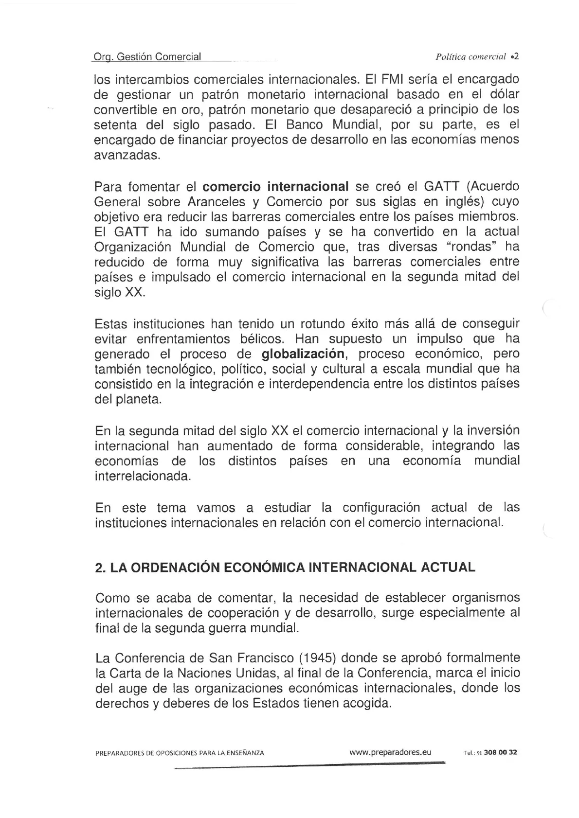 La Conferencia de San Francisco (1945) donde se aprobó formalmente la Carta de la Naciones Unidas, al final de la Conferencia, marca el inicio del auge de las organizaciones económicas internacionales, donde los derechos y deberes de los Estados tienen acogida. PREPARADORES DE OPOSICIONES PARA LA ENSEÑANZA www.preparadores.eu Tel .: 91 308 00 32Política comercial ·3 Org. Gestión Comercial